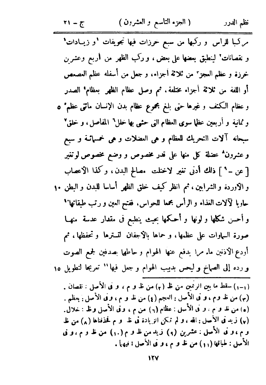 مركباً للرأس وركبها من سبع خرزات فيها تجويفات وزيادات ونقصانات لينطبق بعضها على بعض، وركب الظهر من أربع وعشرين خرزة وعظم العجز من ثلاثة أجزاء، وجعل من أسفله عظم العصعص أو اللفة من ثلاثة أجزاء مختلفة، ثم وصل عظام الظهر بعظام الصدر وعظام الكتف وغيرها حتى بلغ مجموع عظام بدن الإنسان مائتي عظم وثمانية وأربعين عظماً سوى العظام التي حشا بها خلل المفاصل، وخلق سبحانه آلات التحريك للعظام وهي العضلات وهي خمسمائة وسبع وعشرون عضلة كل منها على قدر مخصوص ووضع مخصوص لو تغير عن ذلك أدنى تغير لاختلت مصالح البدن، وكذا الأعصاب والأوردة والشرايين، ثم انظر كيف خلق الظهر أساساً للبدن، والبطن حاوياً لآلات الغذاء والرأس مجمعاً للحواس، ففتح العين ورتب طبقاتها وأحسن شكلها ولونها وأحكمها بحيث ينطبع في مقدار عدسة منها صورة السماوات على عظمها، وحماها بالأجفان لتسترها وتحفظها، ثم أودع الأذنين ماء مراً يدفع عنها الهوام وحاطهما بصدفين لجمع الصوت ورده إلى الصماخ وليحس بدبيب الهوام وجعل فيها تعريجاً لتطويل