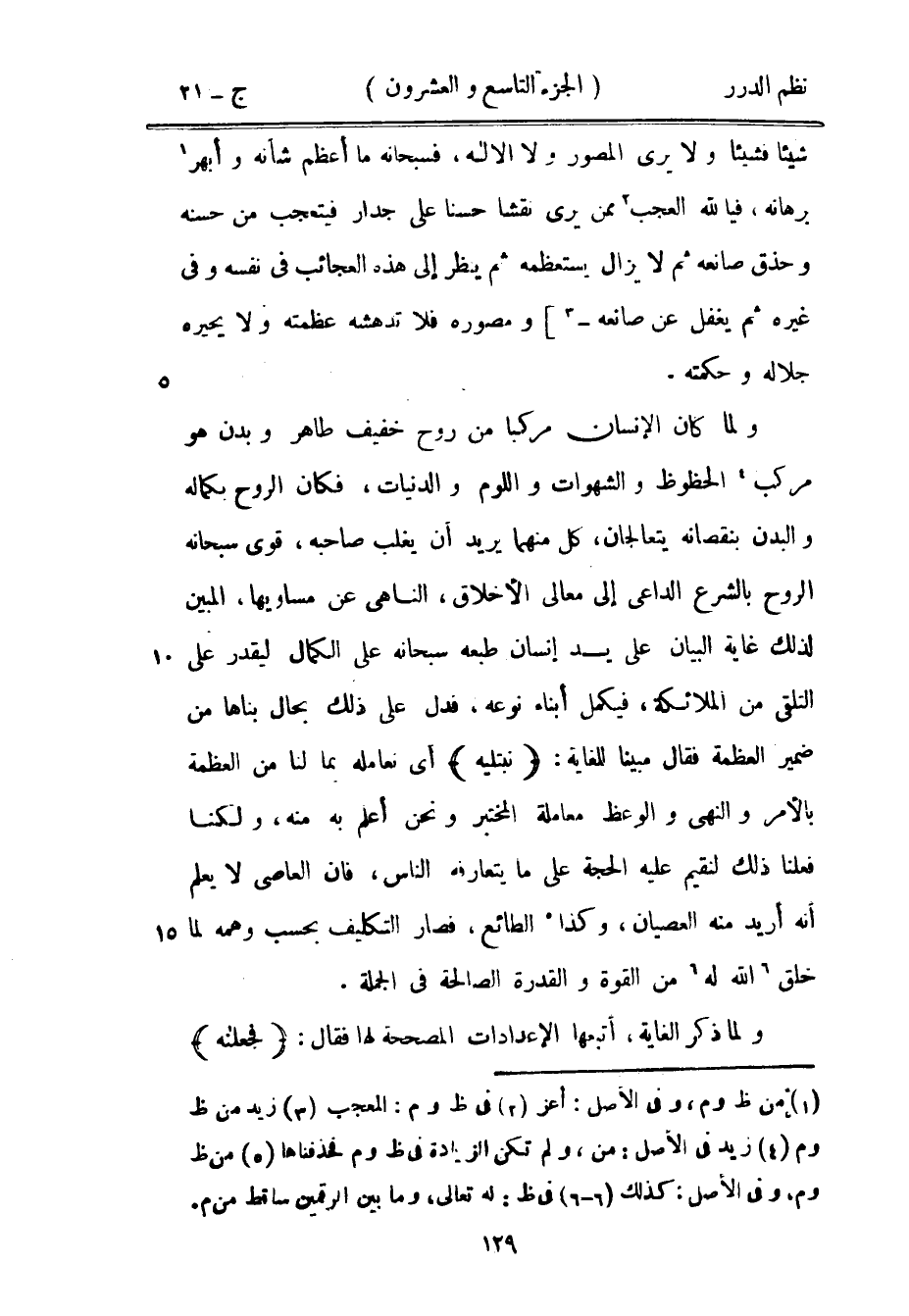 شيئاَ فشيئاً ولا يرى المصور ولا الإله، فسبحانه ما أعظم شأنه وأبهر برهانه، فيالله العجب ممن يرى نقشاً حسناً على جدار فيتعجب من حسنه وحذق صانعه ثم لا يزال يستعظمه ثم ينظر إلى هذه العجائب في نفسه وفي غيره ثم يغفل عن صانعه ومصوره فلا تدهشه عظمته ويحيره جلاله وحكمته.