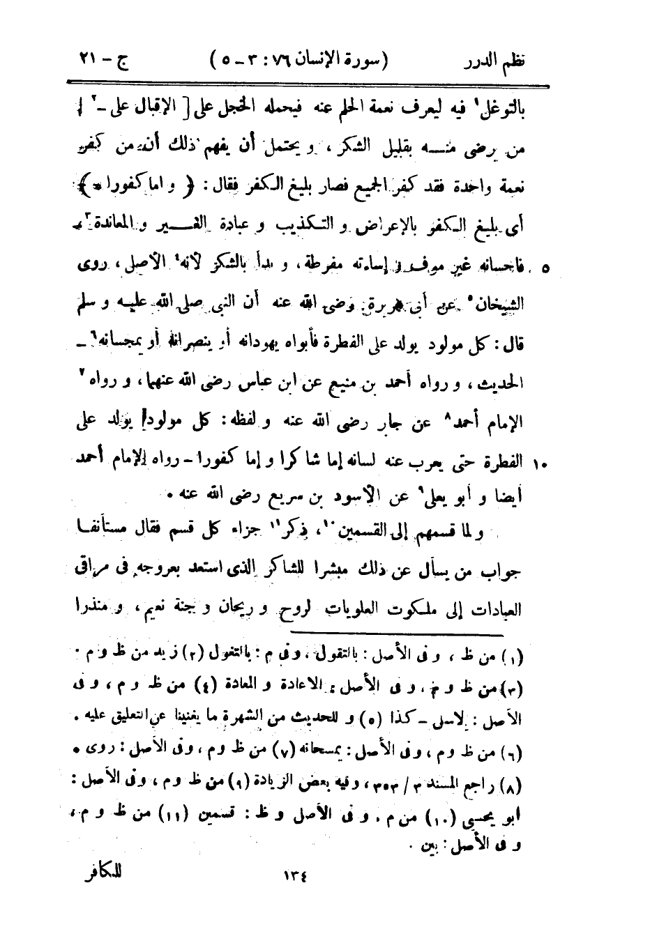 بالتوغل فيه ليعرف نعمة الحلم عنه فيحمله الخجل على الإقبال على من يرضى منه بقليل الشكر، ويحتمل أن يفهم ذلك أن من كفر نعمة واحدة فقد كفر الجميع فصار بليغ الكفر فقال: {وإما كفوراً} أي بليغ الكفر بالإعراض والتكذيب وعبادة الغير والمعاندة فإحسانه غير موف إساءته مفرطة، وبدأ بالشكر لأنه الأصل، روى الشيخان عن أبي هريرة رضي الله عنه أن النبي صَلَّى اللهُ عَلَيْهِ وَسَلَّمَ قال: «كل مولود يولد على الفطرة فأبواه يهودانه أو ينصرانه أو يمجسانه» الحديث، ورواه أحمد بن منيع عن ابن عباس رضي الله عنهما، ورواه الإمام أحمد عن جابر رضي الله عنه ولفظه: «كل مولود يولد على الفطرة حتى يعرب عنه لسانه إما شاكراً وإما كفوراً» رواه الإمام أحمد أيضاً وأبو يعلى عن الأسود بن سريع رضي الله عنه.
