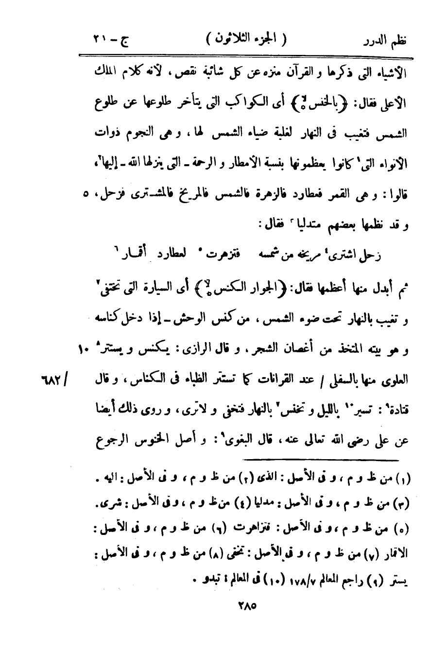 الأشياء التي ذكرها والقرآن منزه عن كل شائبة نقص، لأنه كلام الملك الأعلى فقال: {بالخنس *} أي الكواكب التي يتأخر طلوعها عن طولع الشمس فتغيب في النهار لغلبة ضياء الشمس لها، وهي النجوم ذوات الأنواء التي كانوا يعظمونها بنسبة الأمطار والرحمة - التي ينزلها الله - إليها، قالوا: وهي القمر فعطارد فالزهرة فالشمس فالمريخ فالمشتري فزحل وقد نظمها بعضهم متدلياً فقال: