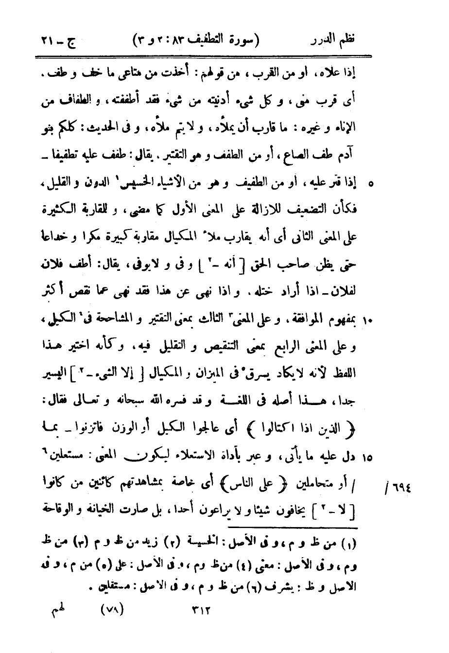 إذا علاه، أو من القرب، من قولهم: أخذت من متاعي ما خف وطف، أي قرب مني، وكل شيء أدنيته من شيء فقد أطففته، والطفاف من الإناء وغيره: ما قارب أن يملأه، ولا يتم ملأه، وفي الحديث: «كلكم بنو آدم طف الصاع» ، أو من الطفف وهو التقتير، يقال: طفف عليه تطفيفا - إذا قتر عليه، أو من الطفيف وهو من الأشياء الخسيس الدون والقليل، فكأن التضعيف للإزالة على المعنى الأول كما مضى، وللمقاربة الكثيرة على المعنى الثاني أي أنه يقار ملء المكيال مقاربة كبيرة مكراً وخداعاً حتى يظن صاحب الحق أنه وفى ولا يوفي، يقال: أطف فلان لفلان - إذا أراد ختله، وإذا نهى عن هذا فقد نهى عما نقص أكثر بمفهوم الموافقة، وعلى المعنى الثالث بمعنى التقتير والمشاححة في الكيل، وعلى المعنى الرابع بمعنى التنقيص والتقليل فيه، وكأنه اختير هذا اللفظ لأنه لا يكاد يسرق في الميزان والمكيال إلا الشيء اليسير جداً، هذا أصله في اللغة وقد فسره الله سبحانه وتعالى فقال: {الذين إذا اكتالوا} أي عالجوا الكيل أو الوزن فاتزنوا - بما دل عليه ما يأتي، وعبر بأداة الاستعلاء ليكون المعنى: مستعلين أو متحاملين {على الناس} أي خاصة بمشاهدتهم كائنين من كانوا لا يخافون شيئاً ولا يراعون أحداً، بل صارت الخيانة والوقاحة