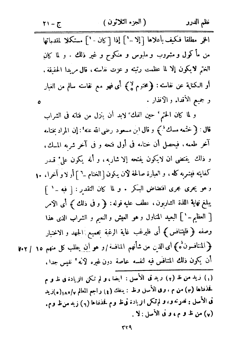 الخمر مطلقاً فكيف بأعلاها إلا إذا كان مستكملاً لمقدماتها من مأكول ومشروب وملبوس ومنكوح وغير ذلك، ولما كان الختم لا يكون إلا لما عظمت رتبته وعزت نفاسته، قال مريداً الحقيقة، أو الكناية عن نفاسته: {مختوم *} أي فهو مع نفاسته سالم من الغبار وجميع الأقذاء والأقذار.