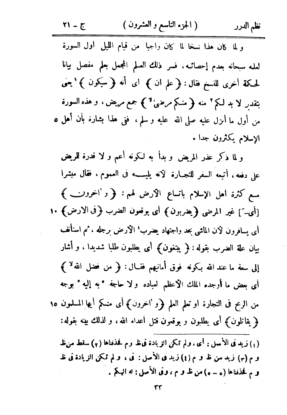 ولما ذكر عذر المريض وبدأ به لكونه أعم ولا قدرة للمريض على دفعه، أتبعه السفر للتجارة لأنه يليه في العموم، فقال مبشراً مع كثرة أهل الإسلام باتساع الأرض لهم: {وآخرون} أي غير المرضى {يضربون} أي يوقعون الضرب {في الأرض} أي يسافرون لأن الماشي بجد واجتهاد يضرب الأرض برجله، ثم استأنف بيان علة الضرب بقوله: {يبتغون} أي يطلبون طلباً شديداً، وأشار إلى سعة ما عند الله بكونه فوق أمانيهم فقال: {من فضل الله} أي بعض ما أوجده الملك الأعظم لعباده ولا حاجة به إليه بوجه من الربح في التجارة أو تعلم العلم {وآخرون} أي منكم أيها المسلمون {يقاتلون} أي يطلبون ويوقعون قتل أعداء الله، ولذلك بينه بقوله:
