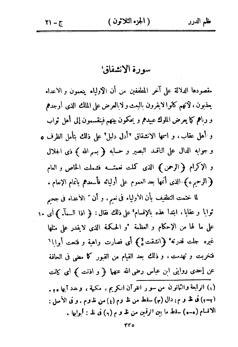 مقصودها الدلالة على آخر المطففين من أن الأولياء ينعمون والأعداء يعذبون، لأنهم كانوا لا يقرون بالبعث ولا بالعرض على الملك الذي أوجدهم ورباهم كما يعرض الملوك عبيدهم ويحكمون بينهم فينقسمون إلى أهل ثواب وأهل عقاب واسمها الانشقاق أدل دليل على ذلك بتأمل الظرف وجوابه الدلال على الناقد البصير وحسابه) بسم الله (ذي الجلال والإكرام) الرحمن (الذي كملت نعمته فشملت الخاص والعام) الرحيم (الذي أتمها بعد العموم على أوليائه فأسعدهم بإتمام الإنعام.