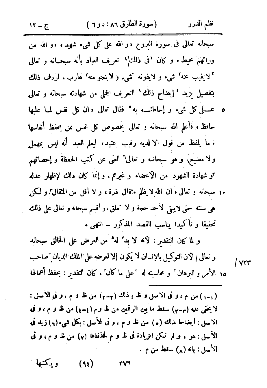 سبحانه وتعالى في سورة البروج {والله على كل شيء شهيد} [البروج: 9] {والله من ورائهم محيط} [البروج: 20] وكان في ذلك تعريف العباد بأنه سبحانه وتعالى لا يغيب عنه شيء ولا يفوته شيء ولا ينجو منه هارب، أردف ذلك بتفصيل يزيد إيضاح ذلك التعريف الجملي من شهادته سبحانه وتعالى على كل شيء وإحاطته به فقال تعالى {إن كل نفس لما عليها حافظ} [الطارق: 4] فأعلم الله سبحانه وتعالى بخصوص كل نفس ممن يحفظ أنفاسها «ما يلفظ من قول إلا لديه رقيب عتيد» ليعلم العبد أنه ليس بمهمل ولا مضيع، وهو سبحانه وتعالى الغني عن كتب الحفظة وإحصائهم وشهادة الشهود من الأعضاء وغيرهم، وإنما كان ذلك لإظهار عدله سبحانه وتعالى {إن الله لا يظلم مثقال ذرة} [النساء: 40] ولا أقل من المثقال، ولكن هي سنته حتى لا يبقى لأحد حجة ولا تعلق، وأقسم سبحانه وتعالى على ذلك تحقيقاً وتأكيداً يناسب القصد المذكور - انتهى.