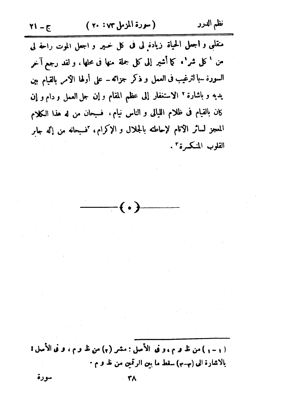 منقلبي واجعل الحياة زيادة لي في كل خير واجعل الموت راحة لي من كل شر» كما أشير إلى كل جملة منها في محلها، ولقد رجع آخر السورة - بالترغيب في العمل وذكر جزائه - على أولها الأمر بالقيام بين يديه وبإشارة الاستغفار إلى عظم المقام وإن جل العمل ودام وإن كان بالقيام في ظلام الليالي والناس نيام، فسبحانه من له هذا الكلام المعجز لسائر الأنام لإحاطته بالجلال والإكرام، فسبحانه من إله جابر القلوب المنكسرة.