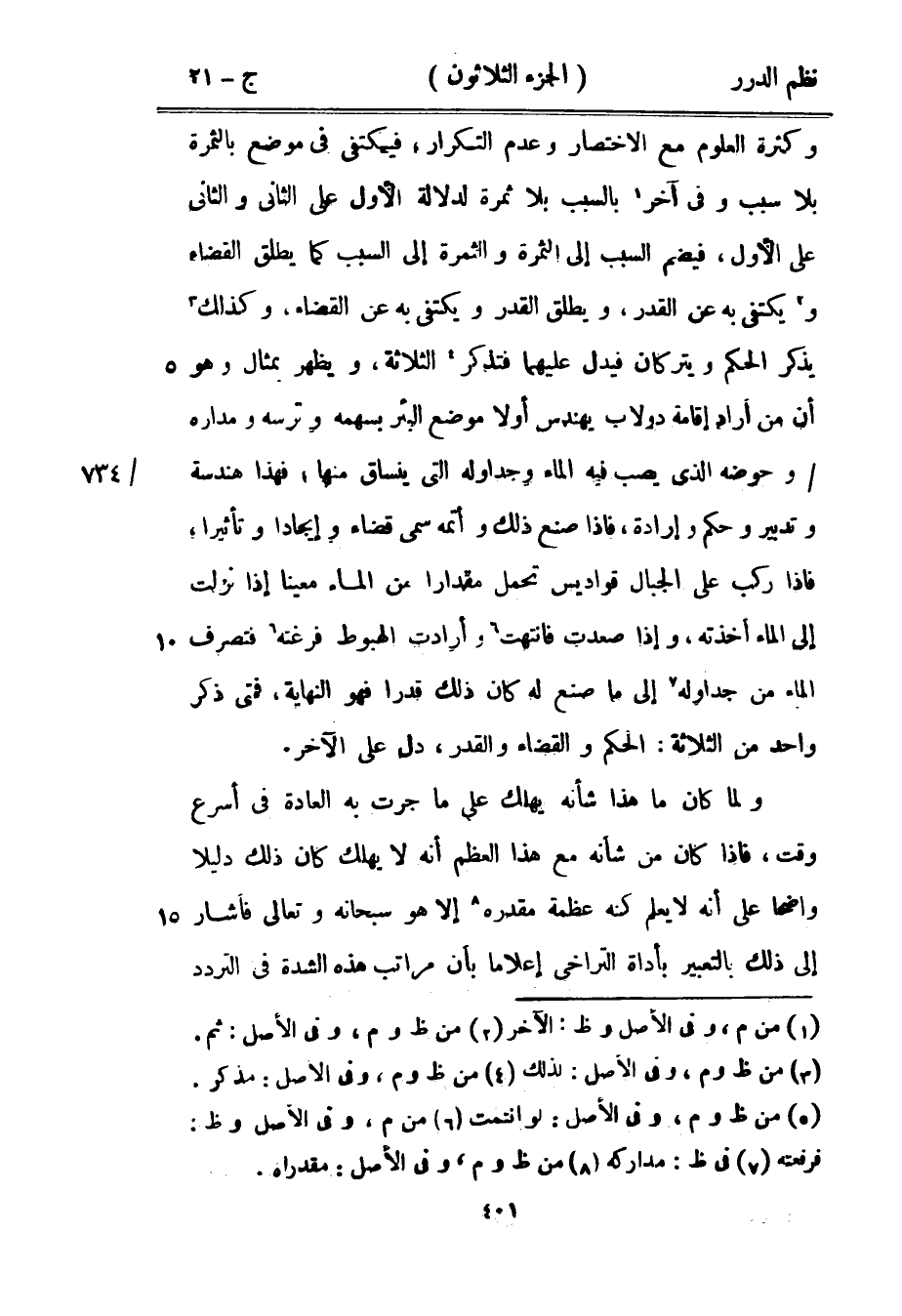 وكثرة العلوم مع الاختصار وعدم التكرار، فيكتفي في موضع بالثمرة بلا سبب وفي آخر بالسبب بلا ثمرة لدلالة الأول على الثاني والثاني على الأول، فيضم السبب إلى الثمرة والثمرة إلى السبب كما يطلق القضاء ويكتفى به عن القدر، ويطلق القدر ويكتفى به عن القضاء، وكذلك يذكر الحكم ويتركان فيدل عليهما فتذكر الثلاثة، ويظهر بمثال وهو أن من أراد إقامة دولاب يهندس أولاً موضع البئر بسهمه وترسه ومداره وحوضه الذي يصب فيه المار وجداوله التي ينساق منها، فهذا هندسة وتدبير وحكم وإرادة، فإذا صنع ذلك وأتمه سمي قضاء وإيجاداً وتأثيراً، فإذا ركب على الجبال قواديس تحمل مقداراً من الماء معيناً إذا نزلت إلى الماء أخذته، وإذا صعدت فانتهت وأرادت الهبوط فرغته فتصرف الماء من جداوله إلى ما صنع له كان ذلك قدراً فهو النهاية، فمتى ذكر واحد من الثلاثة: الحكم والقضاء والقدر، دل على الآخر.