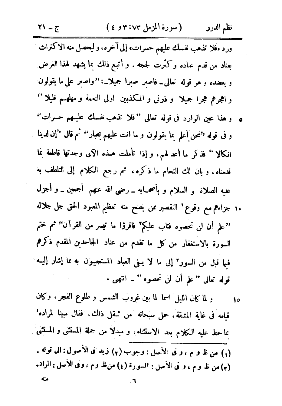 ورد {فلا تذهب نفسك عليهم حسرات} [فاطر: 8] إلى آخره، وليحصل منه الاكتراث بعناد من قدم عناده وكثرة لججه، وأتبع ذلك بما يشهد لهذا الغرض ويعضده وهو قوله تعالى {فاصبر صبراً جميلاً} [المعارج: 5] {واصبر على ما يقولون واهجرهم هجراً جميلاً وذرني والمكذبين أولي النعمة ومهلهم قليلاً} [المزمل: 10 - 11] وهذا عين الوارد في قوله تعالى: {فلا تذهب نفسك عليهم حسرات} [فاطر: 8] وفي قوله {نحن أعلم بما يقولون وما أنت عليهم بجبار} [ق: 45] ثم قال: {إن لدينا أنكالاً} [المزمل: 12] فذكر ما أعد لهم، وإذا تأملت هذه الآي وجدتها قاطعة بما قدمناه، وبان لك التحام ما ذكره، ثم رجع الكلام إلى التلطف به عليه الصلاة والسلام وبأصحابه - رضي الله عنهم أجمعين - وأجزل جزاءهم مع وقوع التقصير ممن يصح منه تعظيم المعبود الحق جل جلاله