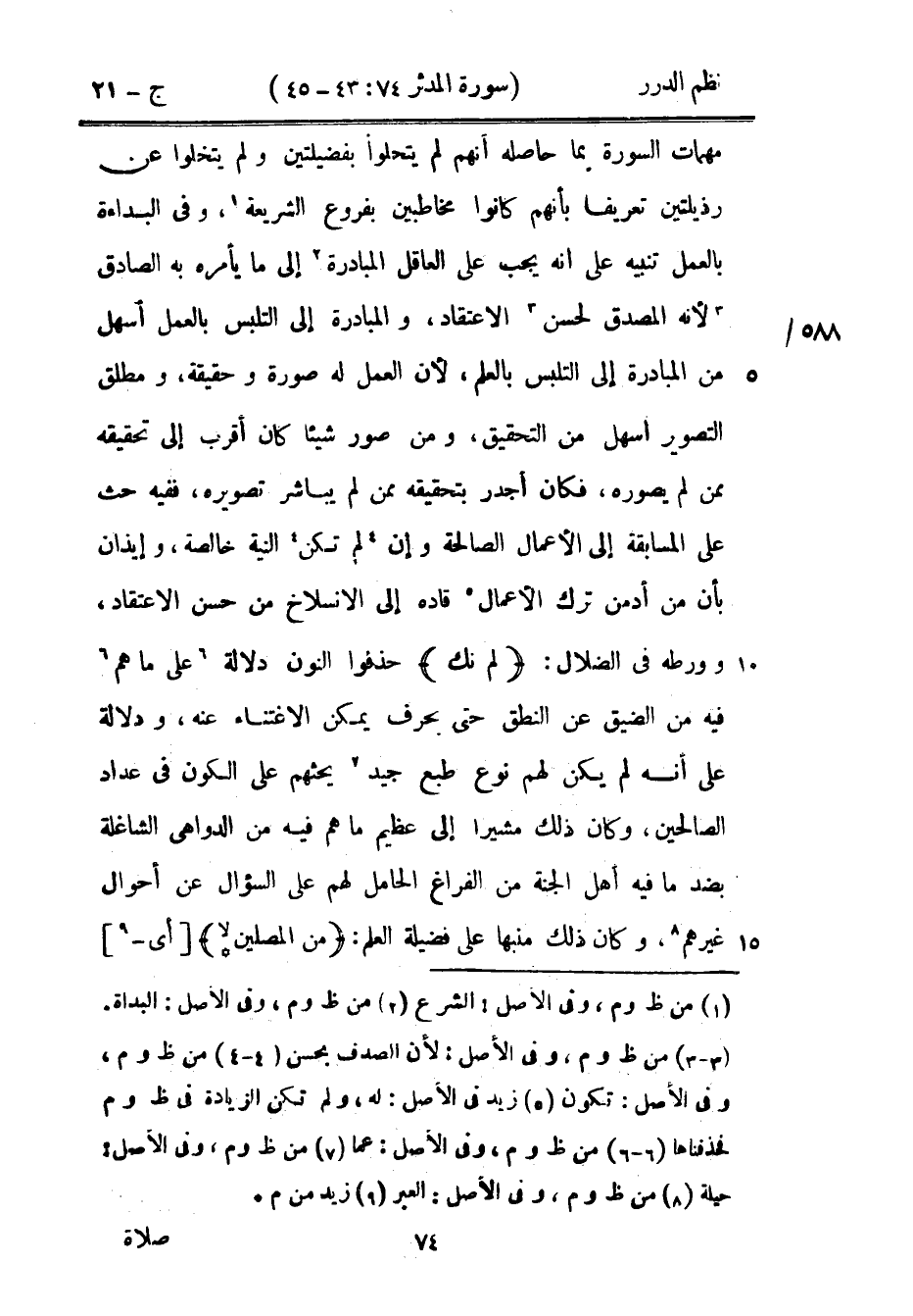 مهمات السورة بما حاصله أنهم لم يتحلوا بفضيلتين ولم يتخلوا عن رذيلتن تعريفاً بأنهم كانوا مخاطبين بفروع الشريعة، وفي البداءة بالعمل تنبيه على أنه يجب على العاقل المبادرة إلى ما يأمره به الصادق لأنه المصدق لحسن الاعتقاد، والمبادرة إلى التلبس بالعمل أسهل من المبادرة إلى التلبس بالعلم، لأن العمل له صورة وحقيقة، ومطلق التصوير أسهل من التحقيق، ومن صور شيئاً كان أقرب إلى تحقيقه ممن لم يصوره، فكان أجدر بتحقيقه ممن لم يباشر تصويره، ففيه حث على المسابقة إلى الأعمال الصالحة وإن لم تكن النية خالصة، وإيذان بأن من أدمن ترك الأعمال قاده إلى الانسلاخ من حسن الاعتقاد، وورطه في الضلال، {لم نك} حذفوا النون دلالة على ما هم فيه من الضيق عن النطق حتى بحرف يمكن الاغتناء عنه، ودلالة على أنه لم يكن لهم نوع طبع جيد يحثهم على الكون في عداد الصالحين، وكان ذلك مشيراً إلى عظيم ما هم فيه من الدواهي الشاغلة بضد ما فيه أهل الجنة من الفراغ الحامل لهم على السؤال عن أحوال غيرهم، وكان ذلك منبهاً على فضيلة العلم: {من المصلين *} أي