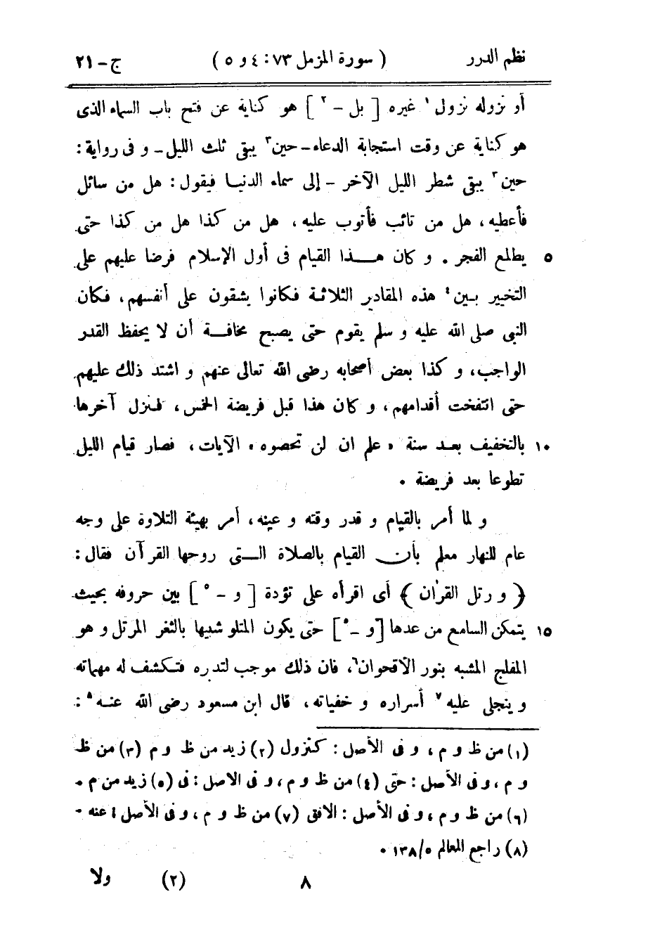 أو نزوله نزول غيره بل هو كناية عن فتح باب السماء الذي هو كناية عن وقت استجابة الدعاء - حين يبقى ثلث الليل - وفي رواية: حين يبقى شطر الليل الآخر - إلى سماء الدنيا فيقول: هل من سائل فأعطيه، هل من تائب فأتوب عليه، هل من كذا هل من كذا حتى يطلع الفجر. وكان هذا القيام في أول الإسلام فرضاً عليهم على التخيير بين هذه المقادير الثلاثة فكانوا يشقون على أنفسهم، فكان النبي صَلَّى اللهُ عَلَيْهِ وَسَلَّمَ يقوم حتى يصبح مخافة أن لا يحفظ القدر الواجب، وكذا بعض أصحابه رضي الله تعالى عنهم واشتد ذلك عليهم حتى انتفخت أقدامهم، وكان هذا قبل فريضة الخمس، فنزل آخرها بالتخفيف بعد سنة