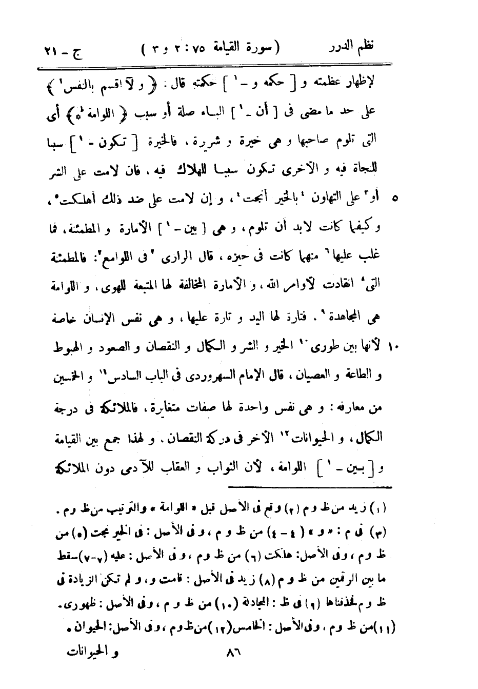 لإظهار عظمته وحكمه وحكمته قال {ولا أقسم بالنفس} على حد ما مضى في أن الباء صلة أو سبب {اللوامة *} أي التي تلوم صاحبها وهي خيرة وشريرة، فالخيرة تكون سبباً للنجاة فيه والأخرى تكون سبباً للهلاك فيه، فإن لامت على الشر أو على التهاون بالخير أنجت، وإن لامت على ضد ذلك أهلكت، وكيفما كانت لا بد أن تلوم، وهي بين الأمارة والمطمئنة، فما غلب عليها منهما كانت في حيزه، قال الرازي في اللوامع: فالمطمئنة التي انقادت لأوامر الله، والأمارة المخالفة لها المتبعة للهوى، واللوامة هي المجاهدة، فتارة لها اليد وتارة عليها، وهي نفس الإنسان خاصة لأنها بين طوري الخير والشر والكمال والنقصان والصعود والهبوط والطاعة والعصيان، قال الإمام السهروردي في الباب السادس والخمسين من معارفه: وهي نفس واحدة لها صفات متغايرة، فالملائكة في درجة الكمال، والحيوانات الأخر في دركة النقصان.