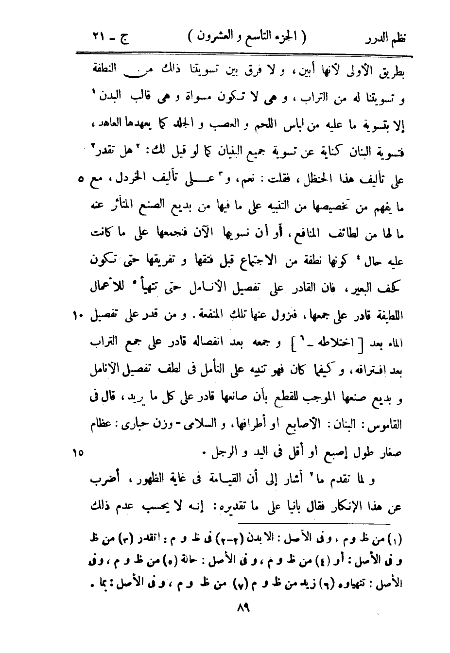 بطريق الأولى لأنها أبين، ولا فرق بيبن تسويتنا ذلك من النطفة وتسويتنا له من التراب، وهي لا تكون مسواة وهي قالب البدن إلا بتسوية ما عليه من لباس اللحم والعصب والجلد كما يعهدها العاهد، فتسوية البنان كناية عن تسوية جميع البنيان كما لو قيل لك: هل تقدر على تأليف هذا الحنظل، فقلت: نعم، وعلى تأليف الخردل، مع ما يفهم من تخصيصها من التنبيه على ما فيها من بديع الصنع المتأثر عنه ما لها من لطائف المنافع، أو أن نسويها الآن فنجمعها على ما كانت عليه حال كونها نطفة من الاجتماع قبل فتقها وتفريقها حتى تكون كخف البعير، فإن القادر على تفصيل الأنامل حتى تتهيأ للأعمال اللطيفة قادر على جمعها، فتزول عنها تلك المنفعة. ومن قدر على تفصيل الماء بعد اختلاطه وجمعه بعد انفصاله قادر على جمع التراب بعد افتراقه، وكيفما كان فهو تنبيه على التأمل في لطف تفصيل الأنامل وبديع صنعها الموجب للقطع بأن صانعها قادر على كل ما يريد، قال في القاموس: البنان: الأصابع أو أطرافها. والسلامى - وزن حبارى: عظام صغار طول إصبع أو أقل في اليد والرجل.