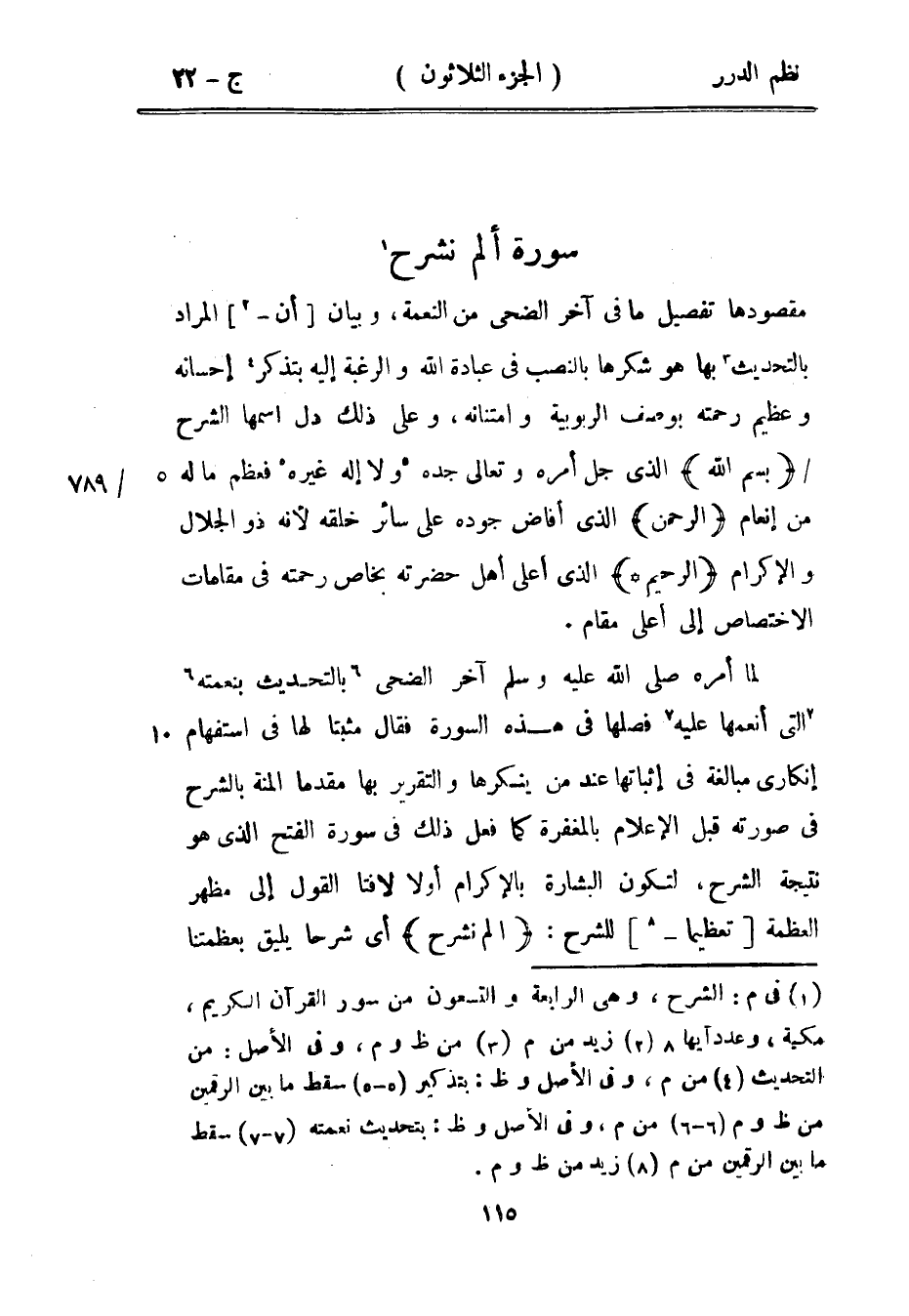 مقصودها تفصيل ما في آخر الضحى من النعمة، وبيان ان المراد بالتحديث ببها هو شكرها بالنصب في عبادة الله والرغبة إليه بتذكر إحسانه وعظيم رحمته بوصف الربوبية وامتنانه، وعلى ذلك دل اسمها الشرح) بسم الله (الذي جل أمره وتعالى جده ولا إله غيره فعظم ما له من إنعام) الرحمن (الذي أفاض جوده على سائر خلقه لأنه ذو الجلال والإكرام) الرحيم (الذي إلى أهل حضرته بخاص رحمته في مقامات الاختصاص إلى أعلى مقام.