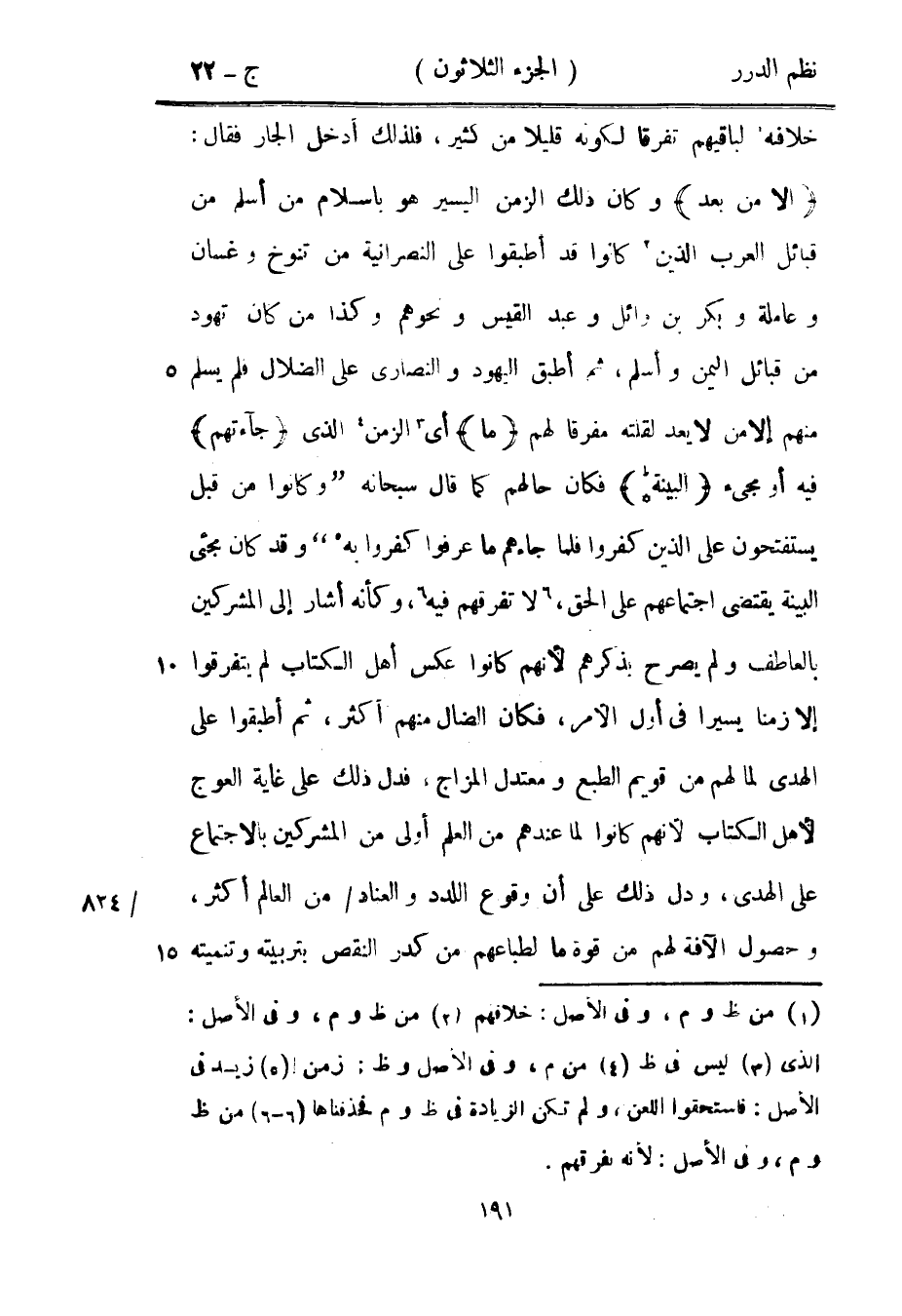 خلافته لباقيهم تفرقاً لكونه قليلاً من كثير، فلذلك أدخل الجارّ فقال: {إلا من بعد} وكان ذلك الزمن اليسير هو بإسلام من أسلم من قبائل العرب الذين كانوا قد أطبقوا على النصرانية من تنوخ وغسان وعاملة وبكر بن وائل وعبد القيس ونحوهم وكذا من كان تهود من قبائل اليمن وأسلم، ثم أطبق اليهود والنصارى على الضلال فلم يسلم منه إلى من لا يعد لقلته مفرقاً لهم {ما} أي الزمن الذي {جاءتهم} فيه أو مجيء {البينة *} فكان حالهم كما قال سبحانه {وكانوا من قبل يستفتحون على الذين كفروا فلما جاءهم ما عرفوا كفروا به} [البقرة: 89] وقد كان مجيء البينة يقتضي اجتماعهم على الحق، لا تفرقهم فيه، وكأنه أشار إلى المشركين بالعاطف ولم يصرح بذكرهم لأنهم كانوا عكس أهل الكتاب لم يتفرقوا إلا زمناً يسيراً في أول الأمر، فكان الضال منهم أكثر، ثم أطبقوا على الهدى لما لهم من قويم الطبع ومعتدل المزاج، فدل ذلك على غاية العوج لأهل الكتاب لأنهم كانوا لما عندهم من العلم أولى من المشركين بالاجتماع على الهدى، ودل ذلك على أن وقوع اللدد والعناد من العالم أكثر، وحصوله الآفة لهم من قوة ما لطباعهم من كدر النقص بتربيته وتنميته