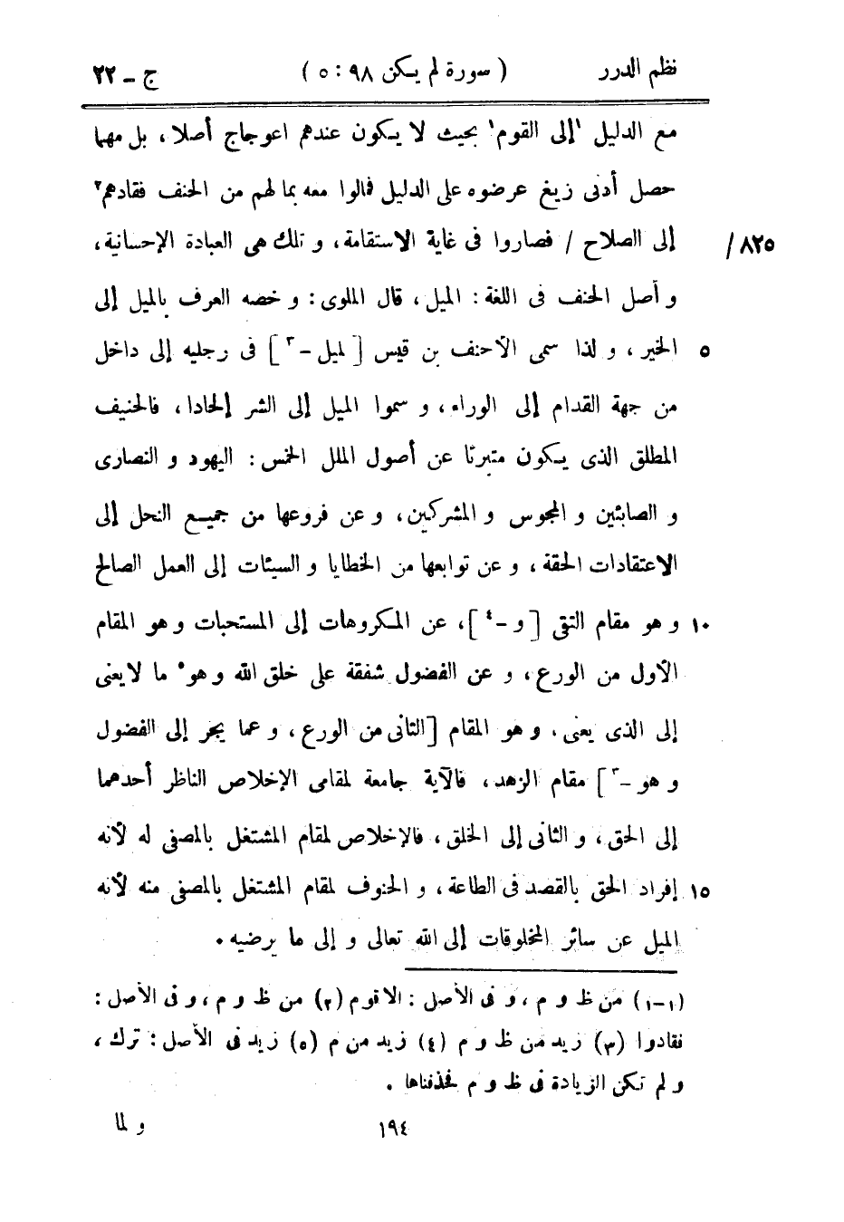 مع الدليل إلى القوم بحيث لا يكون عندهم اعوجاج أصلاً، بل مهما حصل أدنى زيغ عرضوه على الدليل فمالوا معه بما لهم من الحنف فقادهم إلى الصلاح فصاروا في غاية الاستقامة، وتلك هي العبادة الإحسانية، وأصل الحنف في اللغة: الميل، قال الملوي: وخصه العرف بالميل إلى الخير، ولذا سمي الأحنف بن قيس لميل في رجليه إلى داخل من جهة القدام إلى الوراء، وسموا الميل إلى الشر إلحاداً، فالحنيف المطلق الذي يكون متبرئاً عن أصول الملل الخمس: اليهود والنصارى والصابئين والمجوس والمشركين، وعن فروعها من جميع النحل إلى الاعتقادات الحقة، وعن توابعها من الخطايا والسيئات إلى العمل الصالح وهو مقام التقى، وعن المكروهات إلى المستحبات وهو المقام الأول من الورع، وعن الفضول شفقة على خلق الله وهو ما لا يعني إلى الذي يعني، وهو المقام الثاني من الورع، وعما يجر إلى الفضول وهو مقام الزهد، فالآية جامعة لمقامي الإخلاص الناظر أحدهما إلى الحق، والثاني إلى الخلق، فالإخلاص لمقام المشتغل بالمصفى له لأنه إفراد الحق بالقصد في الطاعة، والخوف لمقام المشتغل بالمصفى منه لأنه الميل عن سائر المخلوقات إلى الله تعالى وإلى ما يرضيه.