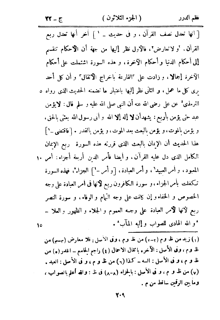 إنها تعدل نصف القرآن» وفي حديث آخر أنها تعدل ربع القرآن، ولا تعارض، فالأول نظر إليها من جهة أن الأحكام تنقسم إلى أحكام الدنيا وأحكام الآخرة، وهذه السورة اشتملت على أحكام الآخرة إجمالاً، وزادت على القارعة بإخراج الأثقال وأن كل أحد يرى كل ما عمل، والثاني نظر إليه باعتبار ما تضمنه الحديث الذي رواه الترمذي عن علي رضي الله عنه أن النبي صَلَّى اللهُ عَلَيْهِ وَسَلَّمَ قال: «لا يؤمن عبد حتى يؤمن بأربع: يشهد أن لا إله إلا الله وأني رسول الله بعثني بالحق، ويؤمن بالموت، ويؤمن بالبعث بعد الموت، ويؤمن بالقدر» فاقتضى هذا الحديث أن الإيمان بالبعث الذي قررته هذه السورة ربع الإيمان الكامل الذي دل عليه القرآن، وأيضاً فأمر الدين أربعة أجزاء: أمر المعبود، وأمر العبيد، وأمر العبادة، وأمر الجزاء، فهذه السورة تكفلت بأمر الجزاء، وسورة الكافرون ربع لأنها في أمر العبادة على وجه الخصوص والخفاء وإن كانت على وجه التمام والوفاء، وسورة النصر ربع لأنها لأمر العبادة على وجه العموم والجلاء والظهور والعلاء - والله الهادي للصواب وإليه المآب.