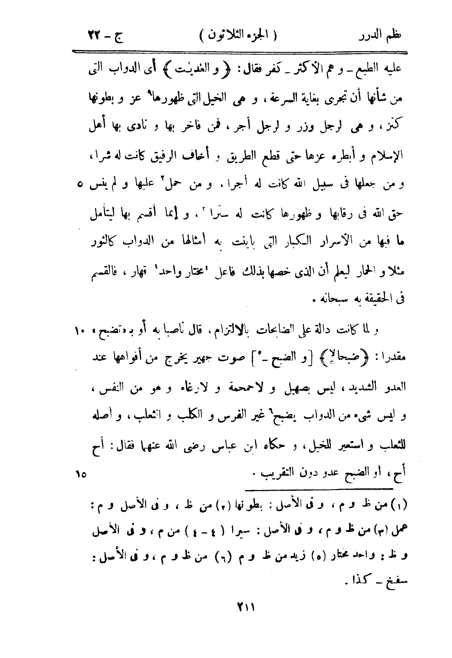 ولما كانت دالة على الضابحات بالالتزام، قال ناصباً به أو ب «تضبح» مقدراً: {ضبحاً *} والضبح صوت جهير من أفواهها عند العدو الشديد، ليس بصهيل ولا حمحمة ولا رغاء وهو النفس، وليس شيء من الدواب يضبح غير الفرس والكلب والثعلب، وأصله للثعلب واستيعر للخيل، وحكاه ابن عباس رضي الله عنهما فقال: أح أح، أو الضبح عدو دون التقريب.