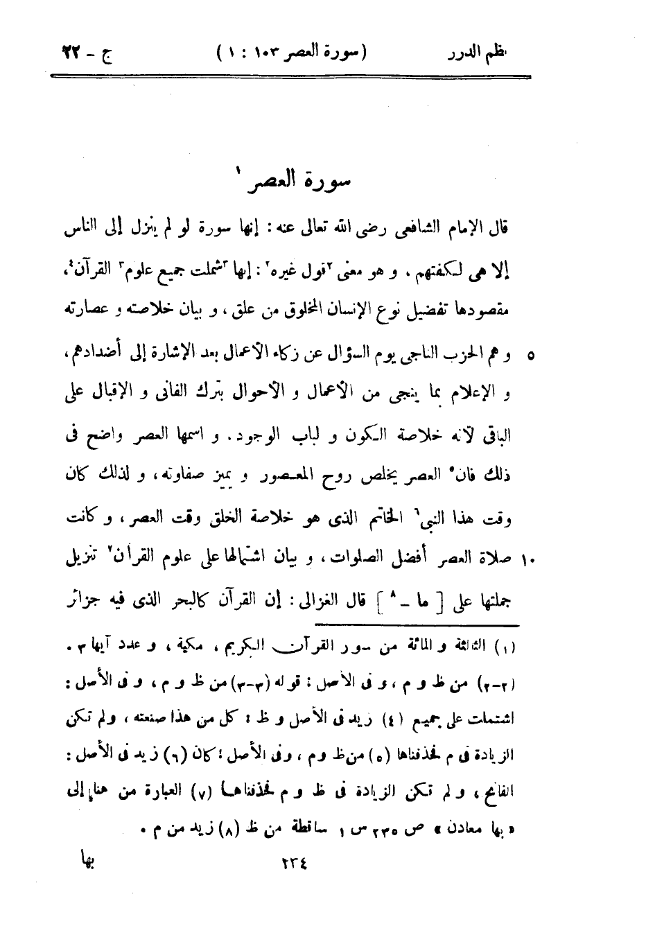 قال الإمام الشافعي رضي الله تعالى عنه: إنها سورة لو لم ينزل إلى الناس إلا هي لكفتهم، وهو معنى قول غيره: " إنها شملت جميع علوم القرآن، مقصودها تفضيل نوع الإنسان المخلوق من علق، وبيان خلاصته وعصارته وهم الحزب الناجي يوم السؤال عن زكاء الأعمال بعد الإشارة إلى أضدادهم، والإعلام بما ينجي من الأعمال والأحوال بترك الفاني والإقبال على الباقي لأنه خلاصة اتلكون ولباب الوجود، واسمها العصر واضح في ذلك فإن العصر يخلص روح المعصور ويميز صفاوته، ولذلك كان وقت هذا النبي الخاتم الذي هو خلاصة الخلق وقت العصر، وكانت صلاة العصر أفضل الصلوات، وبيان اشتمالها على علوم القرآن تنزيل جملتها على ما قال الغزالي: إن القرآن كالبحر الذي فيه جزائر