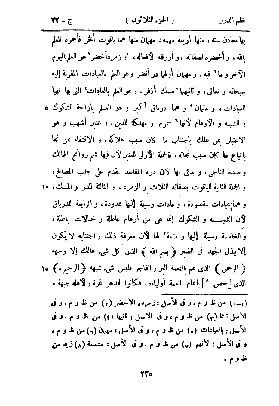 بها معادن ستة، منها أربعة مهمة: مهمان منها هما ياقوت أفخر فأحمره للعلم بالله، وأخضره لصفاته، وأزرقه لأفعاله، وزمرد أخضر هو العلم باليوم الآخر وما فيه، ومهمان أولهما در أنضر وهو العلم بالعبادات المقربة إليه سبحانه وتعالى، وثانيهما مسك أذفر، وهو العلم بالعبادات التي بها تهيأ العبادات، ومتمان وهما درياق أكبر وهو العلم بإزاحة الشكوك، والشبه والأوهام لأنها سموم ومهلكة للدين، وعنبر أشهب وهو الاعتبار بمن هلك باجتناب ما كان سبب هلاكه، والاقتفاء بمن نجا باتباع ما كان سبب نجاته، فالجملة الأولى للعنبر لأن فيها شم روائح الهالك وضده الناجي، وبدئ بها لأن درء المفاسد مقدم على جلب المصالح، والجملة الثانية للياقوت بصفاته الثلاث والزمرد، والثالثة للدر والمسك، وهخما عبادات مقصودة، وعادات وسيلة إليها ممدودة، والرابعة للدرياق لأن الشبه والشكوك إنما هي من أوهام عاطلة وخيالات باطلة، والخامسة وسيلة إليها ومتمة لها لأن معرفة ذلك واجتنابه لا يكون إلا ببذل الجهد في الصبر) بسم الله (الذي كل شيء هالك إلا وجهه) الرحمن (الذي عم بالنعمة البر والفاجر فليس شيء شبهه) الرحيم (الذي خص بإتمام النعمة أولياءه، فكانوا للدهر غرة ولأهله جبهة.