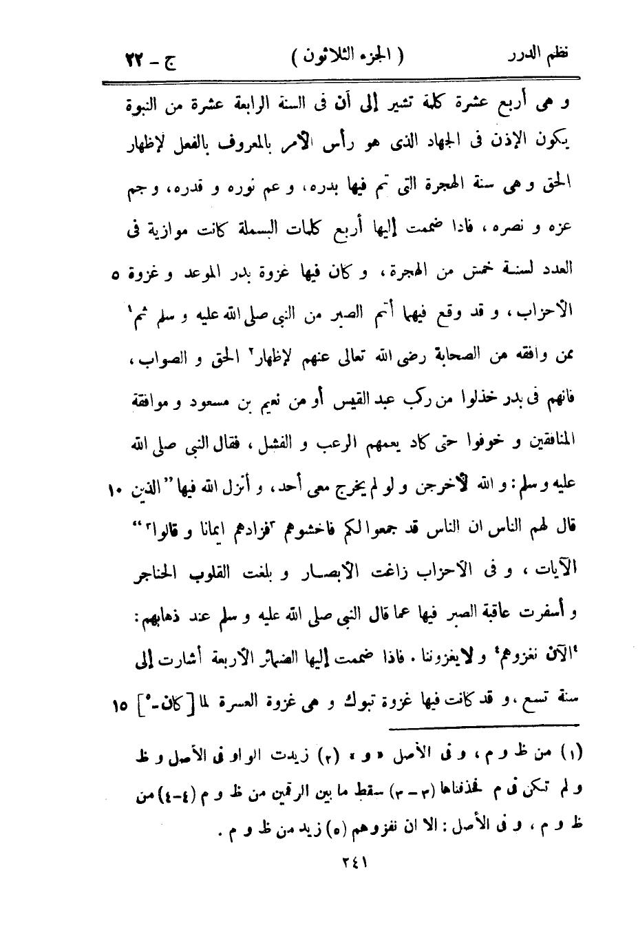 وهي أربع عشرة كلمة تشير إلى أن في السنة الرابعة عشرة من النبوة يكون الإذن في الجهاد الذي هو رأس الأمر بالمعروف بالفعل لإظهار الحق وهي سنة الهجرة التي تم فيها بدره، وعم نوره وقدره، وجم عزه ونصره، فإذا ضممت إليها أربع كلمات البسملة كانت موازية في العدد لسنة خمس من الهجرة، وكان فيها غزوة بدر الموعد وغزوة الأحزاب، وقد وقع فيهما أتم الصبر من النبي صَلَّى اللهُ عَلَيْهِ وَسَلَّمَ ثم ممن وافقه من الصحابة رضي الله تعالى عنهم لإظهار الحق والصواب، فإنهم في بدر خذلوا من ركب عبد القيس أو من نعيم بن مسعود وموافقة المنافقين وخوفوا حتى كاد يعمهم الرعب والفشل، فقال النبي صَلَّى اللهُ عَلَيْهِ وَسَلَّمَ