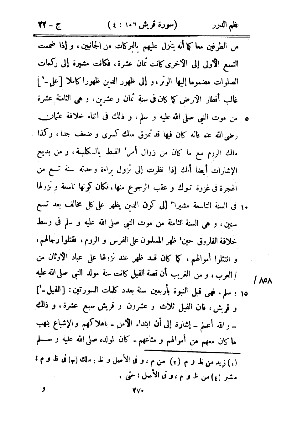 من الطرفين معاً كما أنه يتنزل عليهم بالبركات من الجانبين، وإذا ضممت التسع الأولى إلى الأخرى كانت ثمان عشرة، فكانت مشيرة إلى ركعات الصلوات مضموماً إليها الوتر، وإلى ظهور الدين ظهوراً كاملاً على غالب أقطار الأرض كما كان في سنة ثمان وعشرين، وهي الثامنة عشر من موت النبي صَلَّى اللهُ عَلَيْهِ وَسَلَّمَ، وذلك في أثناء خلافة عثمان رضي الله عنه فإنه كان فيها قد تمزق ملك كسرى وضعف جداً، وكذا ملك الروم مع ما كان من زوال أمر القبط بالكلية، ومن بديع الإشارات أيضاً أنك إذا نظرت إلى نزول براءة وجدته سنة تسع من الهجرة في غزوة تبوك وعقب الرجوع منها، فكان كونها تاسعة ونزولها في السنة التاسعة مشيراً إلى كون الدين يظهر على كل مخالف بعد تسع سنين، وهي السنة الثامنة من موت النبي صَلَّى اللهُ عَلَيْهِ وَسَلَّمَ في وسط خلافة الفاروق حين ظهر المسلمون على الفرس والروم، فقتلوا رجالهم، وانتثلوا أموالهم، كما كان قد ظهر عند نزولها على عباد الأوثان من العرب، ومن الغريب أن قصة الفيل كانت سنة مولد النبي صَلَّى اللهُ عَلَيْهِ وَسَلَّمَ، فهي قبل النبوة بأربعين سنة بعدد كلمات السورتين: الفيل وقريش، فإن الفيل ثلاث وعشرون وقريش سبع عشرة، وذلك - والله أعلم - إشارة إلى أن ابتداء الأمن - بإهلاكهم والإشباع بنهب ما كان معهم من أموالهم ومتاعهم - كان لمولده صَلَّى اللهُ عَلَيْهِ وَسَلَّمَ