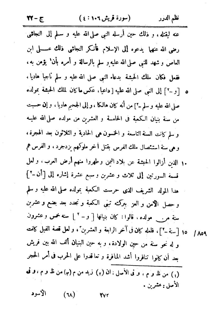 ليقتله، وذلك حين أرسله النبي صَلَّى اللهُ عَلَيْهِ وَسَلَّمَ إلى النجاشي رضي الله عنهما يدعوه إلى الإسلام فأنكر النجاشي ذلك على ابن العاص وشهد للنبي صَلَّى اللهُ عَلَيْهِ وَسَلَّمَ بالرسالة وأمره بأن يؤمن به، ففعل فكان ملك الحبشة بدعاء النبي صَلَّى اللهُ عَلَيْهِ وَسَلَّمَ ناجياً هادياً، وإلى النبي صَلَّى اللهُ عَلَيْهِ وَسَلَّمَ داعياً، عكس ما كان لملك الحبشة بمولده صَلَّى اللهُ عَلَيْهِ وَسَلَّمَ من أنه كان هالكاً، وإلى الجحيم هاوياً، وإن حسبت من سنة بنيان الكعبة في الخامسة والعشرين من مولده صَلَّى اللهُ عَلَيْهِ وَسَلَّمَ كانت السنة التاسعة والخمسون هي الحادية والثلاثون بعد الهجرة، وهي سنة استئصال ملك الفرس بقتل آخر ملوكهم يزدجرد، والفرس هم الذين أزالوا الحبشة عن بلاد اليمن وطهروا منهم أرض العرب، ولعل قسمة السورتين إلى ثلاث وعشرين وسبع عشرة إشارة إلى أن هذا المولد الشريف الذي حرست الكعبة بمولده صَلَّى اللهُ عَلَيْهِ وَسَلَّمَ وحصل الأمن والعز ببركته تبنى الكعبة وتجدد بعد بضع وعشرين سنة من مولده، قالوا: كان بنيانها وسنه خمس وعشرون سنة، فلعله كان في آخر الرابعة والعشرين، ولعل قصة الفيل كانت وله نحو سنة من حين الولادة، وبه حين البنيان ألف الله بين قريش بعد أن كانوا تنافروا أشد المنافرة وتعاقدوا على الحرب في أمر الحجر