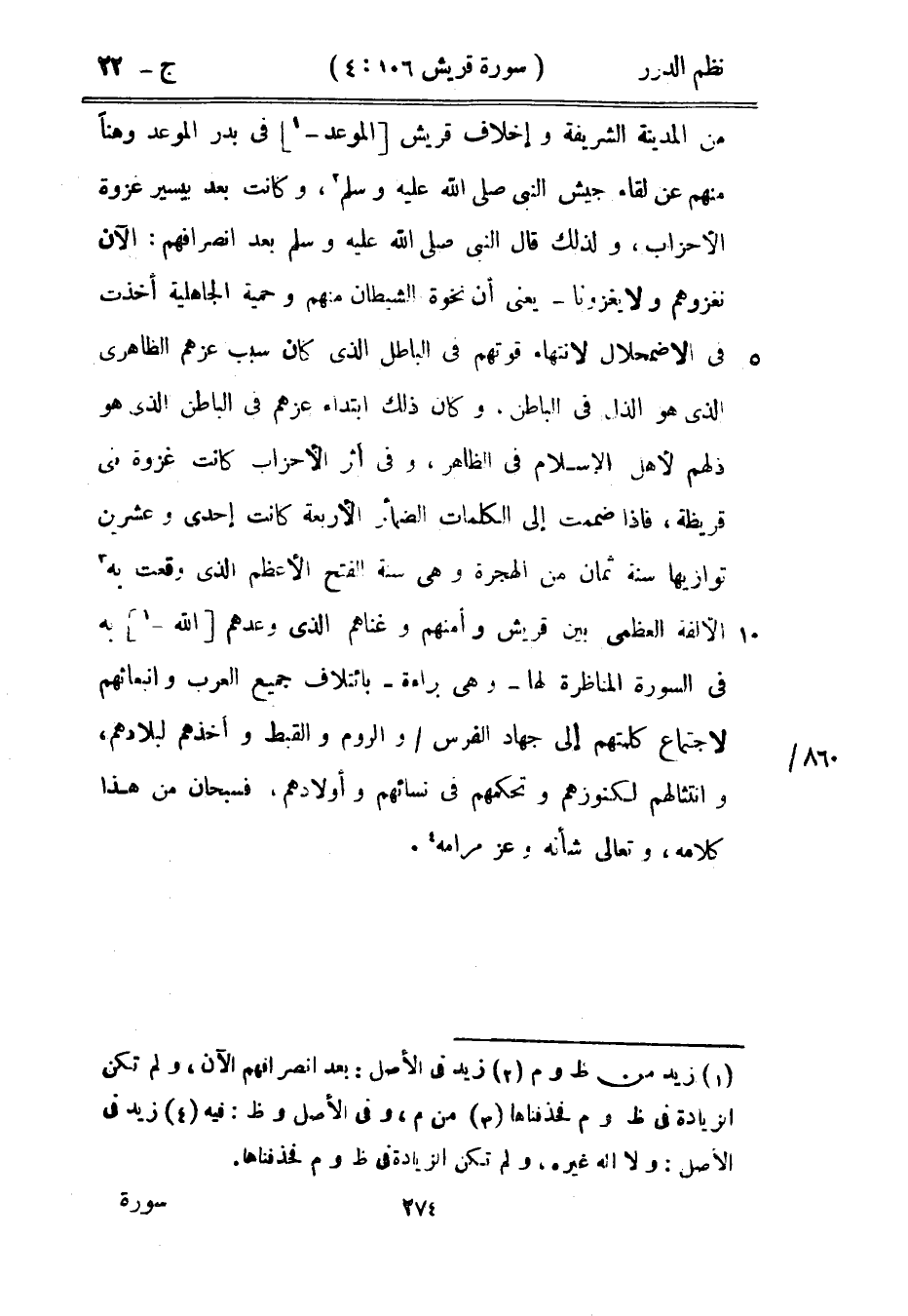 «الآن نغزوهم ولا يغزونا» يعني أن نخوة الشيطان منهم وحمية الجاهلية أخذت في الاضمحلال لانتهاء قوتهم في الباطل الذي كان سبب عزهم الظاهري الذي هو الذل في الباطن، وكان ذلك ابتداء عزهم في الباطن الذي هو ذلهم لأهل الإسلام في الظاهر، وفي أثر الأحزاب كانت غزوة بني قريظة، فإذا ضممت إلى الكلمات الضمائر الأربعة كانت إحدى وعشرين توازيها سنة ثمان من الهجرة وهي سنة الفتح الأعظم الذي وقعت به الألفة العظمى بين قريش وأمنهم وغناهم الذي وعدهم الله به في السورة المناظرة لها - وهي براءة - باتئلاف جميع العرب وانبعاثهم لاجتماع كلمتهم إلى جهاد الفرس والروم والقبط وأخذهم لبلادهم، وانتثالهم لكنوزهم وتحكمهم في نسائهم وأولادهم، فسبحان من هذا كلامه، وتعالى شأنه وعز مرامه.