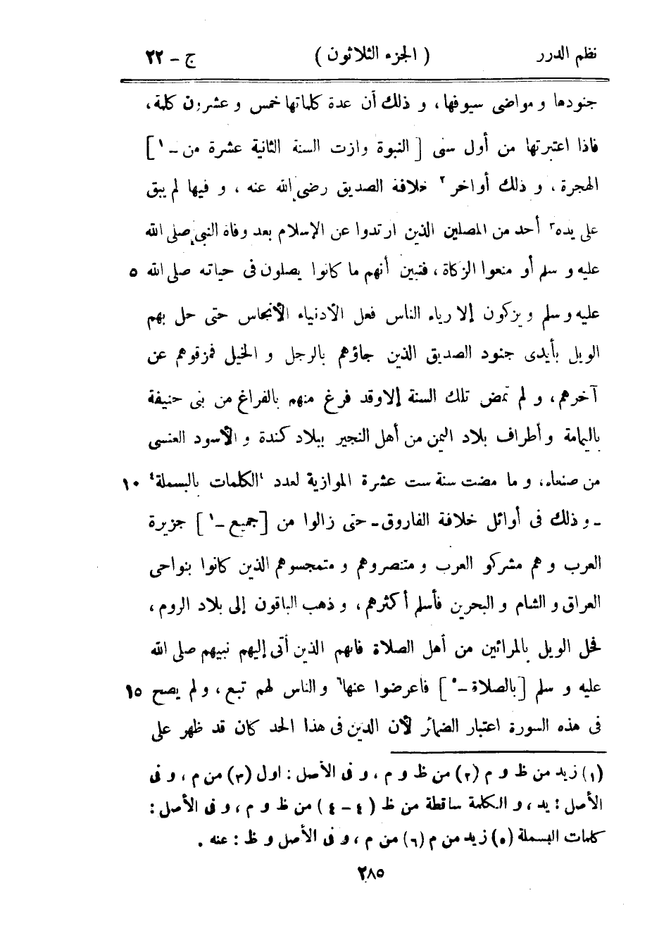 جنودها ومواضي سيوفها، وذلك أن عدة كلماتها خمس وعشرون كلمة فإذا اعتبرتها من أول سني النبوة وازت السنة الثانية عشرة من الهجرة، وذلك أواخر خلافة الصديق رضي الله عنه، وفيها لم يبق على يده أحد من المصلين الذين ارتدوا عن الإسلام بعد وفاة النبي صَلَّى اللهُ عَلَيْهِ وَسَلَّمَ أو منعوا الزكاة، فتبين أنهم ما كانوا يصلون في حياته صَلَّى اللهُ عَلَيْهِ وَسَلَّمَ ويزكون إلا رياء الناس فعل الأدنياء الأنجاس حتى حل بهم الويل بأيدي جنود الصديق الذين جاؤوهم بالرجل والخيل فمزقوهم عن آخرهم، ولم تمض تلك السنة إلا وقد فرغ منهم بالفراغ من بني حنيفة باليمامة وأطراف بلاد اليمن من أهل النجير ببلاد كندة والأسود العنسي من صنعاء، وما مضت سنة ست عشرة الموازية لعدد الكلمات بالبسملة - وذلك في أوائل خلافة الفاروق - حتى زالوا من جميع جزيرة العرب وهم مشركو العرب ومتنصروهم ومتمجسوهم الذين كانوا بنواحي العراق والشام والبحرين فأسلم أكثرهم، وذهب الباقون إلى بلاد الروم، فحل الويل بالمرائين من أهل الصلاة فإنهم الذين أتى إليهم نبيهم صَلَّى اللهُ عَلَيْهِ وَسَلَّمَ بالصلاة فأعرضوا عنها والناس لهم تبع، ولم يصح في هذه السورة اعتبار الضمائر لأن الدين في هذا الحد كان قد ظهر على
