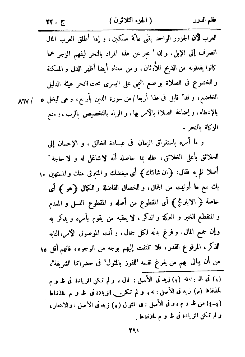 العرب لأن الجزور الواحد يغني مائة مسكين، وإذا أطلق العرب المال انصرف إلى الإبل، ولذا عبر عن هذا المراد بالنحر ليفهم الزجر عما كانوا يفعلونه من الذبح للأوثان، ومن معناه أيضاً أظهر الذل والمسكنة والخشوع في الصلاة بوضع اليمنى على اليسرى تحت النحر هيئة الذليل الخاضع، وقد قابل في هذا أربعاً من سورة الدين بأربع، وهي البخل بالإعطاء، وإضاعة الصلاة بالأمر بها، والرياء بالتخصيص بالرب، ومنع الزكاة بالنحر.