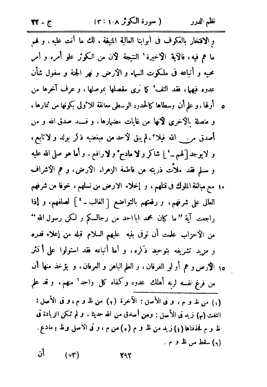 والافتخار بالعكوف في أبوابنا العالية المنيفة، لك ما أنت عليه، ولهم ما هم فيه، فالآية الأخيرة النتيجة لأن من الكوثر علو أمره وأمر محبيه وأتباعه في ملكوت السماء والأرض ونهر الجنة وسفول شأن عدوه فيهما، فقد التف كما ترى مفصلها بموصلها، وعرف آخرها من أولها، وعرف أن وسطاها كالحدود الوسطى معانقة للأولى بكونها من ثمارها، ومتصلة بالأخرى لأنها من غايات مضمارها، وقد صدق الله ومن أصدق من الله قيلاً، لم يبق لأحد من مبغضيه ذكر بولد ولا تابع، ولا يوجد لهم شاكر ولا مادح ولا رافع، وأما هو صَلَّى اللهُ عَلَيْهِ وَسَلَّمَ فقد ملأت ذريته من فاطمة الزهراء الأرض، وهم الأشرف مع مبالغة الملوك في قتلهم، وإخلاء الأرض من نسلهم، خوفاً من شرفهم العالي على شرفهم، ورفعتهم بالتواضع الغالب لصلفهم، وإذا راجعت آية