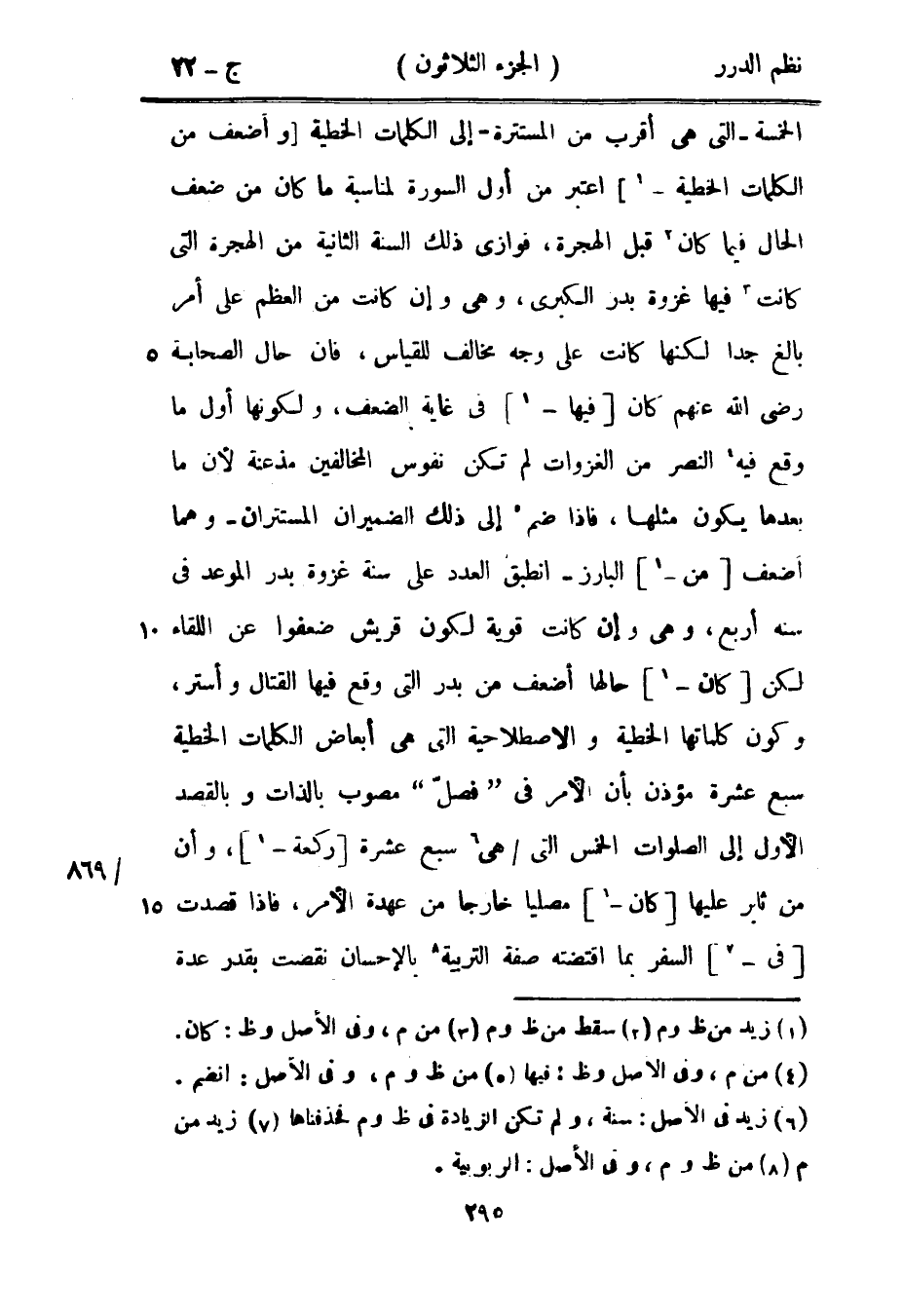 الخمسة - التي هي أقرب من المستترة - إلى الكلمات الخطية وأضعف من الكلمات الخطية اعتبر من أول السورة لمناسبة ما كان من ضعف الحال فيما كان قبل الهجرة، فوازى ذلك السنة الثانية من الهجرة التي كانت فيها غزوة بدر الكبرى، وهي وإن كانت من العظم على أمر بالغ جداً لكنها كانت على وجه مخالف للقياس، فإن حال الصحابة رضي الله عنهم كان فيها في غاية الضعف، ولكونها أول ما وقع فيه النصر من الغزوات لم تكن نفوس المخالفين مذعنة لأن ما بعدها يكون مثلها، فإذا ضم إلى ذلك الضميران المستتران - وهما أضعف من البارز - انطبق العدد على سنة غزوة بدر الموعد في سنة أربع، وهي وإن كانت قوية لكون قريش ضعفوا عن اللقاء لكن كان حالها أضعف من بدر التي وقع فيها القتال وأستر، وكون كلماتها الخطية والاصطلاحية التي هي أبعاض الكلمات الخطية سبع عشرة مؤذن بأن الأمر في {فصلِّ} مصوب بالذات بالقصد الأول إلى الصلوات الخمس التي هي سبع عشرة ركعة، وأن من ثابر عليها كان مصلياً خارجاً من عهدة الأمر، فإذا قصدت في السفر بما اقتضته صفة التربية بالإحسان نقصت بقدر عدة
