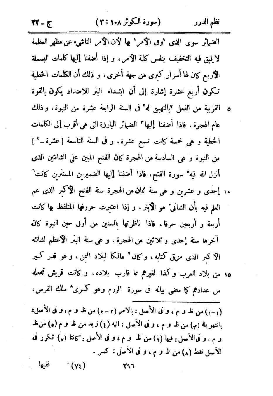 الضمائر سوى الذي وفى الأمر بها لأن الأمر الناشىء عن مظهر العظمة لا يليق فيه التخفيف بنفسه كلمة الأمر، وإذا أضفنا إليها كلمات البسملة الأربعة كان لها أسرار كبرى من جهة أخرى، وذلك أن الكلمات الخطية تكون أربع عشرة إشارة إلى أن ابتداء البتر للأضداد يكون بالقوة القريبة من الفعل بالتهييء له في السنة الرابعة عشرة من النبوة، وذلك عام الهجرة، فإذا أضفنا إليها الضمائر البارزة التي هي أقرب إلى الكلمات الخطية وهي خمسة كانت تسع عشرة، وفي السنة التاسعة عشرة من النبوة وهي السادسة من الهجرة كان الفتح المبين على الشانئين الذي أنزل الله فيه سورة الفتح، فإذا أضفنا إليها الضميرين المستترين كانت إحدى وعشرين وهي سنة ثمان من الهجرة سنة الفتح الأكبر الذي عم العلم فيه بأن الشانىء هو الأبتر، وإذا اعتبرت حروفها المتلفظ بها كانت أربعة وأربعين حرفاً، فإذا ناظرتها بالسنين من أول حين النبوة كان آخرها سنة إحدى وثلاثين من الهجرة، وهي سنة البتر الأعظم لشانئه الأكبر الذي مزق كتابه، وكان مالكاً لبلاد اليمن، وهو قدر كبير من بلاد العرب وكذا لغيرهم مما قارب بلاده، وكانت قريش تجعله من عدادهم كما مضى بيانه في سورة الروم وهو كسرى ملك الفرس،