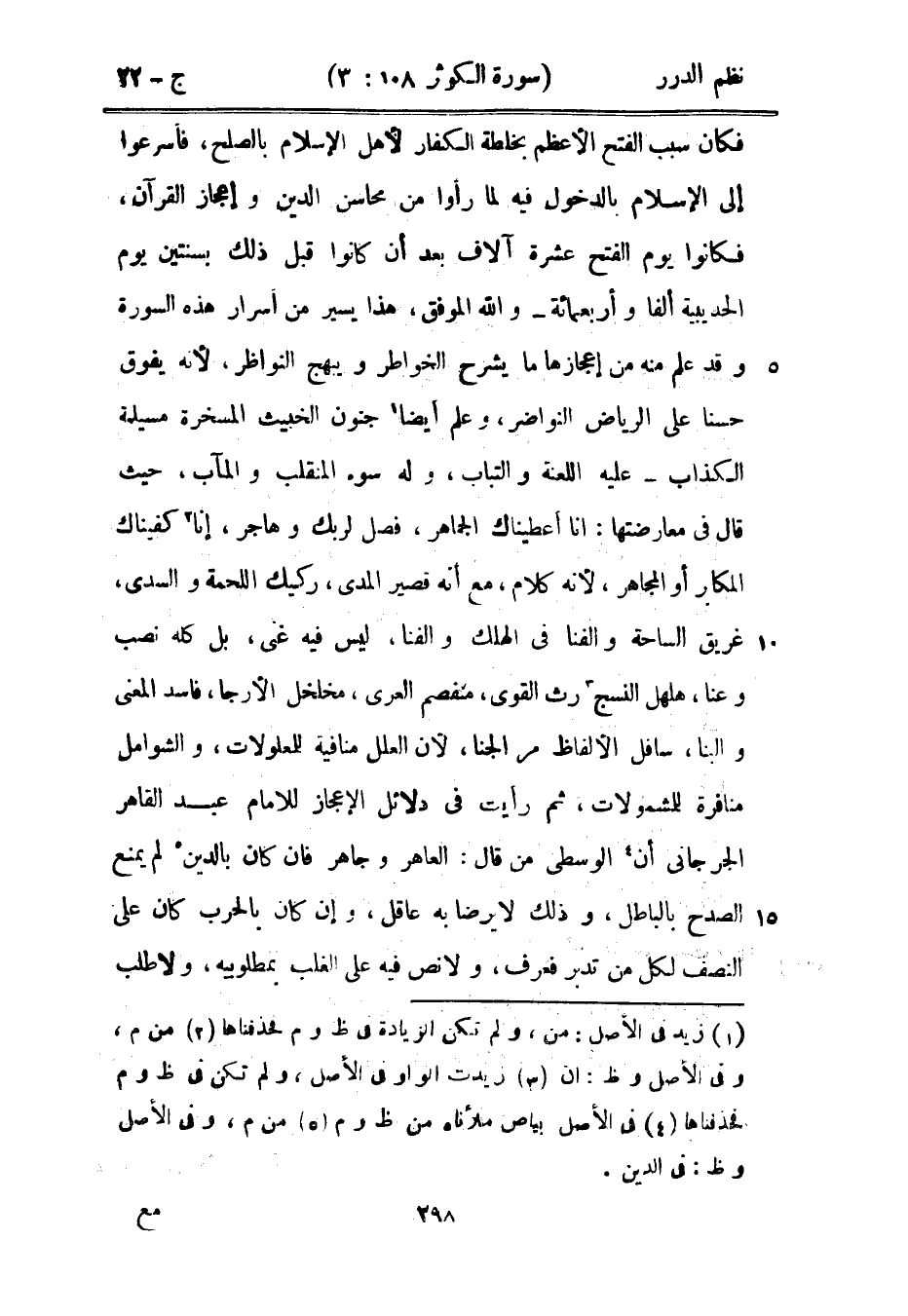 فكان سبب الفتح الأعظم بخلطة الكفار لأهل الإسلام بالصلح، فأسرعوا إلى الإسلام بالدخول فيه لما رأوا من محاسن الدين وإعجاز القرآن، فكانوا يوم الفتح عشرة آلاف بعد أن كانوا قبل ذلك بسنتين يوم الحديبية ألفاً وأربعمائة - والله الموفق، هذا يسير من أسرار هذه السورة وقد علم منه من إعجازها ما يشرح الخواطر ويبهج النواظر، لأنه يفوق حسناً على الرياض النواضر، وعلم أيضاً جنون الخبيث المسخرة مسيلمة الكذاب - عليه اللعنة والتباب، وله سوء المنقلب والمآب، حيث قال في معارضتها: إنا أعطيناك الجماهر، فصل لربك وهاجر، إنا كفيناك المكابر أو المجاهر، لأنه كلام، مع أنه قصير المدى، ركيك اللحمة والسدى، غريق الساحة والفنا في الهلك والفنا، ليس فيه غنى، بل كله نصب وعنا، هلهل النسج رث القوى، منفصم العرى، مخلخل الأرجا، فاسد المعنى والبنا، سافل الألفاظ مر الجنى، لأن العلل منافية للمعلولات، والشوامل منافرة للمشمولات، ثم رأيت في دلائل الإعجاز للإمام عبد القاهر الجرجاني أن الوسطى من قال: العاهر وجاهر فإن كان بالدين لم يمنع الصدح بالباطل، وذلك لا يرضى به عاقل، وإن كان بالحرب كان على النصف لكل من تدبر فعرف، ولا نص فيه على الغلب بمطلوبيه، ولا طلب