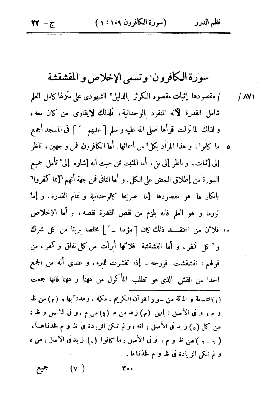 مقصودها إثبات مقصود الكوثر بالدليل الشهودي على منزلها كامل العلم شامل القدرة لأنه المنفرد بالوحدانية، فلذلك لا يقاوي من كان معه، ولذلك لما نزلت قرأها (صَلَّى اللهُ عَلَيْهِ وَسَلَّمَ) عليهم في المسجد أجمع ما كانوا، وهذا المراد بكل من أسمائها. أما الكافرون فمن وجهين، ناظر إلى إثبات، وناظر إلى نفي، أما المثبت فمن حيث أنه إشارة إلى تأمل جميع السورة من إطلاق البعض على الكل، وأما النافي فمن جهة أنهم إنما كفروا بإنكار ما هو مقصودها إما صريحا كالوحدانية وتمام القدرة، وإما لزوما وهو العم فإنه يلزم من نقص القدرة نقصه، وأما الإخلاص فلأن من اعتقد ذلك كان مؤمنا مخلصا برئيا من كل شرك وكل كفر، وأما القشقشة فلأنها أبرأت من كل نفاق وكفر، من قولهم: تقشقشت قروحه - إذا تقشرت للبرء، وعندي أنه من الجمع أخذا من القش الذي هو تطلب المأكول من ههنا وههنا فإنها جمعت