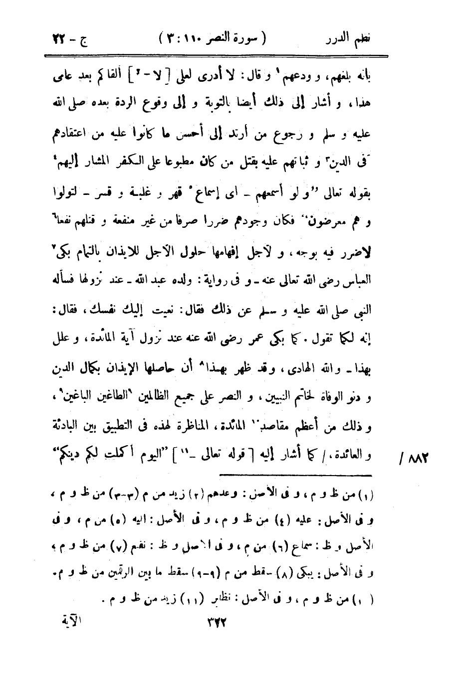 بأنه بلغهم، وودعهم وقال: لا أدري لعلي لا ألقاكم بعد عامي هذا، وأشار إلى ذلك أيضاً بالتوبة وإلى وقوع الردة بعده صَلَّى اللهُ عَلَيْهِ وَسَلَّمَ ورجوع من ارتد إلى أحسن ما كانوا عليه من اعتقادهم في الدين وثباتهم عليه بقتل من كان مطبوعاً على الكفر المشار إليهم بقوله تعالى: {ولو أسمعهم} [الأنفال: 23]- أي إسماع قهر وغلبة وقسر - {لتولوا وهم معرضون} [الأنفال: 23] فكان وجودهم ضرراً صرفاً من غير منفعة وقتلهم نفعاً لا ضرر فيه بوجه، ولأجل إفهامها حلول الأجل للإيذان بالتمام بكى العباس رضي الله تعالى عنه - وفي رواية: ولده عبد الله - عند نزولها فسأله النبي صَلَّى اللهُ عَلَيْهِ وَسَلَّمَ فقال: «نعيت إليك نفسك» فقال: إنه لكما تقول. كما بكى عمر رضي الله عنه عند نزول آية المائدة، وعلل بهذا - والله الهادي، وقد ظهر بهذا أن حاصلها الإيذان بكمال الدين ودنو الوفاة لخاتم النبيين، والنصر على جميع الظالمين الطاغين الباغين، وذلك من أعظم مقاصد المائدة، المناظرة لهذه في التطبيق بين البادئة والعائدة، كما أشار إليه قوله تعالى: {اليوم أكملت لكم دينكم} [