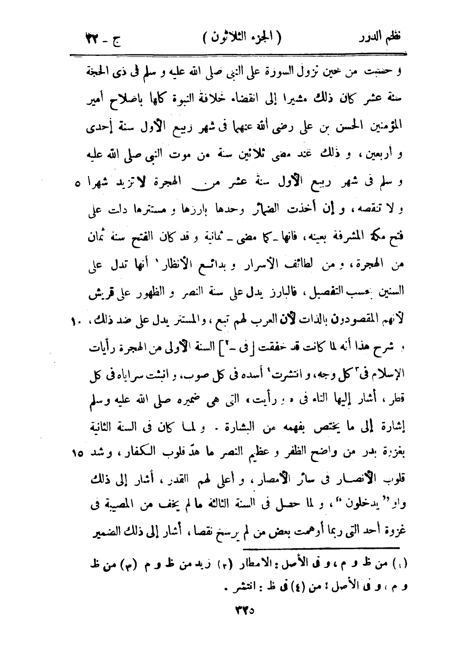 وحسبت من حين نزول السورة على النبي صَلَّى اللهُ عَلَيْهِ وَسَلَّمَ في ذي الحجة سنة عشر كان ذلك مشيراً إلى انقضاء خلافة النبوة كلها بإصلاح أمير المؤمنين الحسن بن علي رضي الله عنهما في شهر ربيع الأول سنة إحدى وأربعين، وذلك عند مضي ثلاثين سنة من موت النبي صَلَّى اللهُ عَلَيْهِ وَسَلَّمَ في شهر ربيع الأول سنة عشر من الهجرة لا تزيد شهراً ولا تنقصه، وإن أخذت الضمائر وحدها بارزها ومستترها دلت على فتح مكة المشرفة بعينه، فإنها - كما مضى - ثمانية وقد كان الفتح سنة ثمان من الهجرة، ومن لطائف الأسرار وبدائع الأنظار أنها تدل على السنين بحسب التفصيل، فالبارز يدل على سنة النصر والظهور على قريش لأنهم المقصودون بالذات لأن العرب لهم تبع، والمستتر يدل على ضد ذلك، وشرح هذا أنه لما كانت قد خفقت في السنة الأولى من الهجرة رايات الإسلام في كل وجه، وانتشرت أسده في كل صوب، وانبثت سراياه في كل قطر، أشار إليها التاء في {ورأيت} التي هي ضميره صَلَّى اللهُ عَلَيْهِ وَسَلَّمَ إشارة إلى ما يختص بفهمه من البشارة. ولما كان في السنة الثانية بغزوة بدر من واضح الظفر وعظيم النصر ما هدّ قلوب الكفار، وشد قلوب الأنصار في سائر الأمصار، وأعلى لهم القدر، أشار إلى ذلك واو {يدخلون} ، ولما حصل في السنة الثالثة ما لم يخف من المصيبة في غزوة أحد التي ربما أوهمت بعض من لم يرسخ نقصاً، أشار إلى ذلك