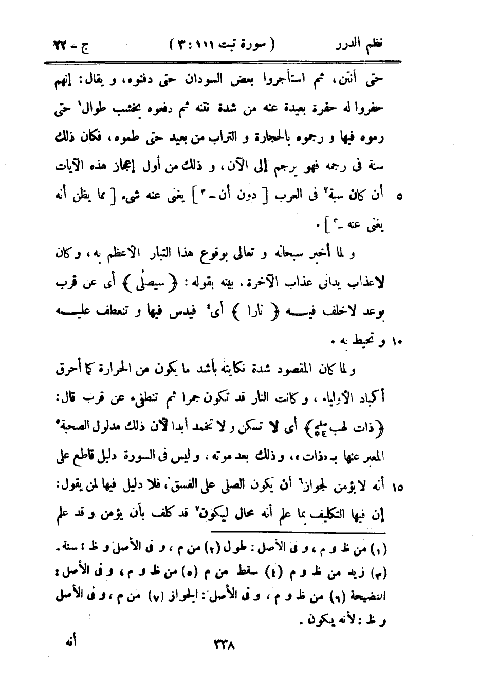 حتى أنتن ثم استأجروا بعض السودان حتى دفنوه، ويقال: إنهم حفروا له حفرة بعيدة عنه من شدة نتنه ثم دفعوه بخشب طوال حتى رموه فيها ورجموه بالحجارة والتراب من بعيد حتى طموه، فكان ذلك سنة في رجمه فهو يرجم إلى الآن، وذلك من أول إعجاز هذه الآيات أن كان سبة في العرب دون أن يغني عنه شيء مما يظن أنه يغني عنه.