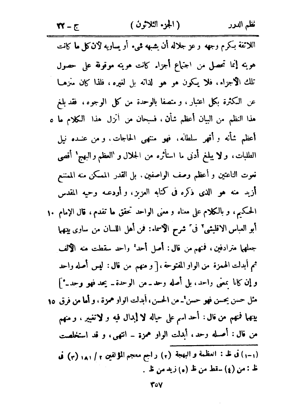 اللائقة بكرم وجهه وعز جلاله أن يشبهه شيء أو يساويه لأن كل ما كانت هويته إنما تحصل من اجتماع أجزاء كانت هويته موقوفة على حصول تلك الأجزاء، فلا يكون هو هو لذاته بل لغيره، فلذا كان منزهاً عن الكثرة بكل اعتبار، ومتصفاً بالوحدة من كل الوجوه، فقد بلغ هذا النظم من البيان أعظم شأن، فسبحان من أنزل هذا الكلام ما أعظم شأنه وأقهر سلطانه، فهو منتهى الحاجات، ومن عنده نيل الطلبات، ولا يبلغ أدنى ما استأثره من الجلال والعظم والبهج أقصى نعوت الناعتين وأعظم وصف الواصفين، بل القدر الممكن منه الممتنع أزيد منه هو الذي ذكره في كتابه العزيز، وأودعه وحيه المقدس الحكيم، وبالكلام على معناه ومعنى الواحد تحقق ما تقدم، قال الإمام أبو العبا الإقليشي في شرح الأسماء: فمن أهل اللسان من ساوى بينهما جعلهما مترادفين، فمنهم من قال: أصل أحد واحد سقطت منه الألف ثم أبدلت الهمزة من الواو المفتوحة، ومنهم من قال: ليس أصله واحد وإن كانا بمعنى واحد، بل أصله وحد - من الوحدة - يحد فهو وحد - مثل حسن يحسن فهو حسن - من الحسن، أبدلت الواو همزة، وأما من فرق بينهما فمنهم من قال: أحد اسم على حياله لا إبدال فيه ولا تغيير، ومنهم من قال: أصله وحد، أبدلت الواو همزة - انتهى، وقد استخلصت