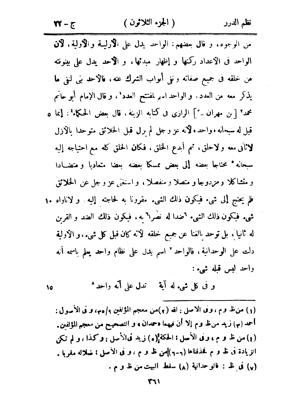 من الوجوه، وقال بعضهم: الواحد يدل على الأزلية والأولية، لأن الواحد في الأعداد ركنها وإظهار مبدئها، والأحد يدل على بينونته من خلقه في جميع صفاته ونفي أبواب الشرك عنه، فالأحد بني لنفي ما ذكر معه من العدد، والواحد اسم لمفتتح العدد، وقال الإمام أبو حاتم محمد بن مهران الرازي في كتابه الزينة، قال بعض الحكماء: إنما قيل له سبحانه «واحد» لأنه عز وجل لم يزل قبل الخلائق متوحداً بالأزل لا ثاني معه ولا خلق، ثم أبدع الخق، فكان الخلق كله مع احتياجه إليه سبحانه محتاجاً بعضه إلى بعض ممسكاً بعضه بعضاً متعادياً ومتضاداً ومتشاكلاً ومزدوجاً ومتصلاً ومنفصلاً، واستغنى عز وجل عن الخلائق فلم يحتج إلى شيء فيكون ذلك الشيء مقروناً به لحاجته إليه ولا ناواه شيء فيكون ذلك الشيء ضداً له نصراً به، فيكون ذلك الضد والقرين له ثانياً، بل توحد بالغنى عن جميع خلقه لأنه كان قبل كل شيء، والأولية دلت على الوحدانية، فالواحد اسم يدل على نظام واحد يعلم باسمه أنه واحد ليس قبله شيء: