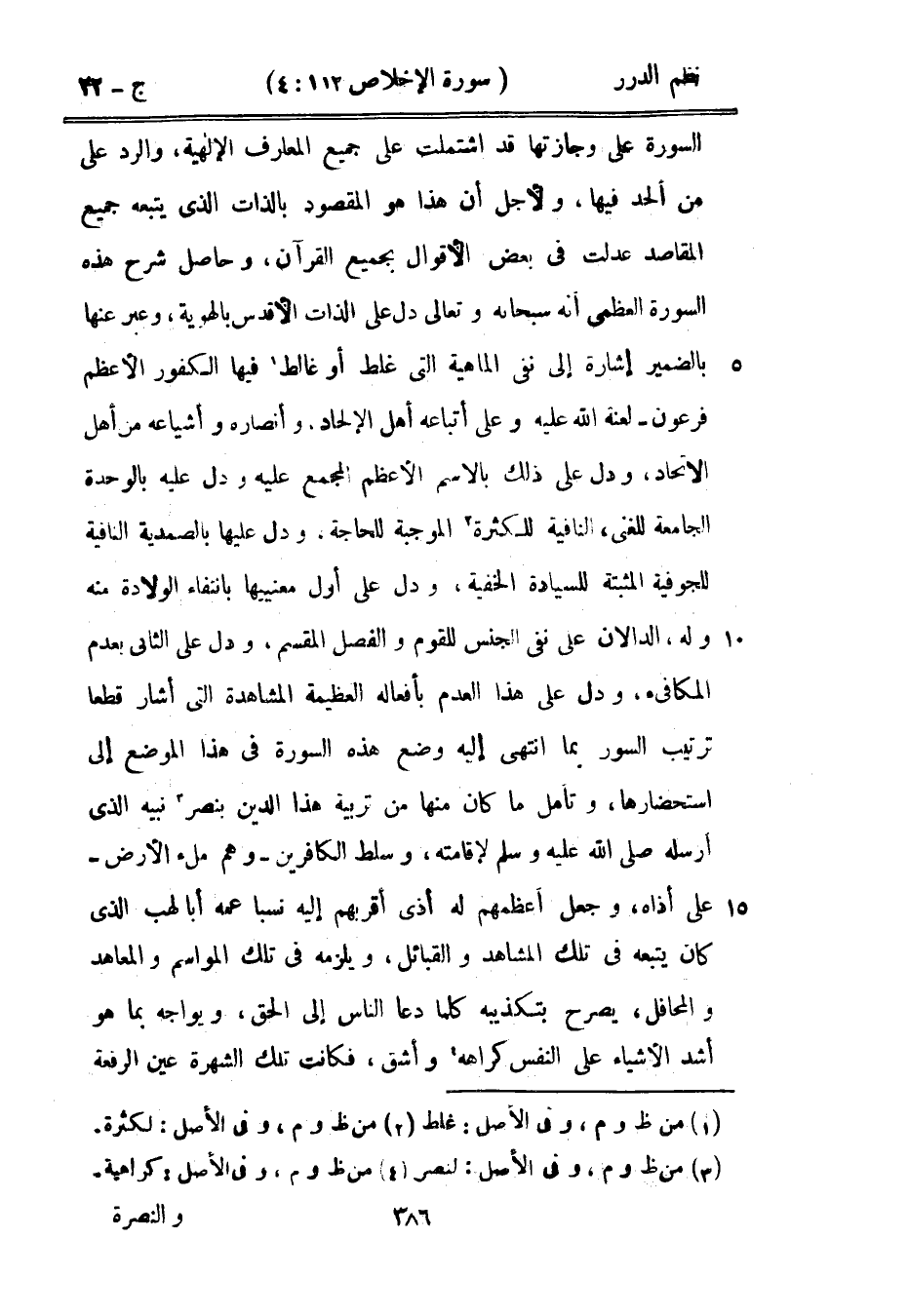 السورة على وجازتها قد اشتملت على جميع المعارف الإلهية والرد على من ألحد فيها، ولأجل أن هذا هو المقصود بالذات الذي يتبعه جميع المقاصد عدلت في بعض الأقوال بجميع القرآن، وحاصل شرح هذه السورة العظمى أنه سبحانه وتعالى دل على الذات الأقدس بالهوية، وعبر عنها بالضمير إشارة إلى نفي الماهية التي غلظ أو غالط فيها الكفور الأعظم فرعون - لعنة الله عليه وعلى أتباعه أهل الإلحاد، وأنصاره وأشياعه من أهل الاتحاد، ودل على ذلك بالاسم الأعظم المجمع عليه ودل عليه بالوحدة الجامعة للغنى، النافية للكثرة الموجبة لحاجة، ودل عليها بالصمدية النافية للجوفية المثبتة للسيادة الخفية، ودل على أول معنييها بانتفاء الولادة منه وله، الدالان على نفي الجنس للقوم والفصل المقسم، ودل على الثاني بعدم المكافىء، ودل على هذا العدم بأفعاله العظيمة المشاهدة التي أشار قطعاً ترتيب السور بما انتهى إليه وضع هذه السورة في هذا الموضع إلى استحضارها.