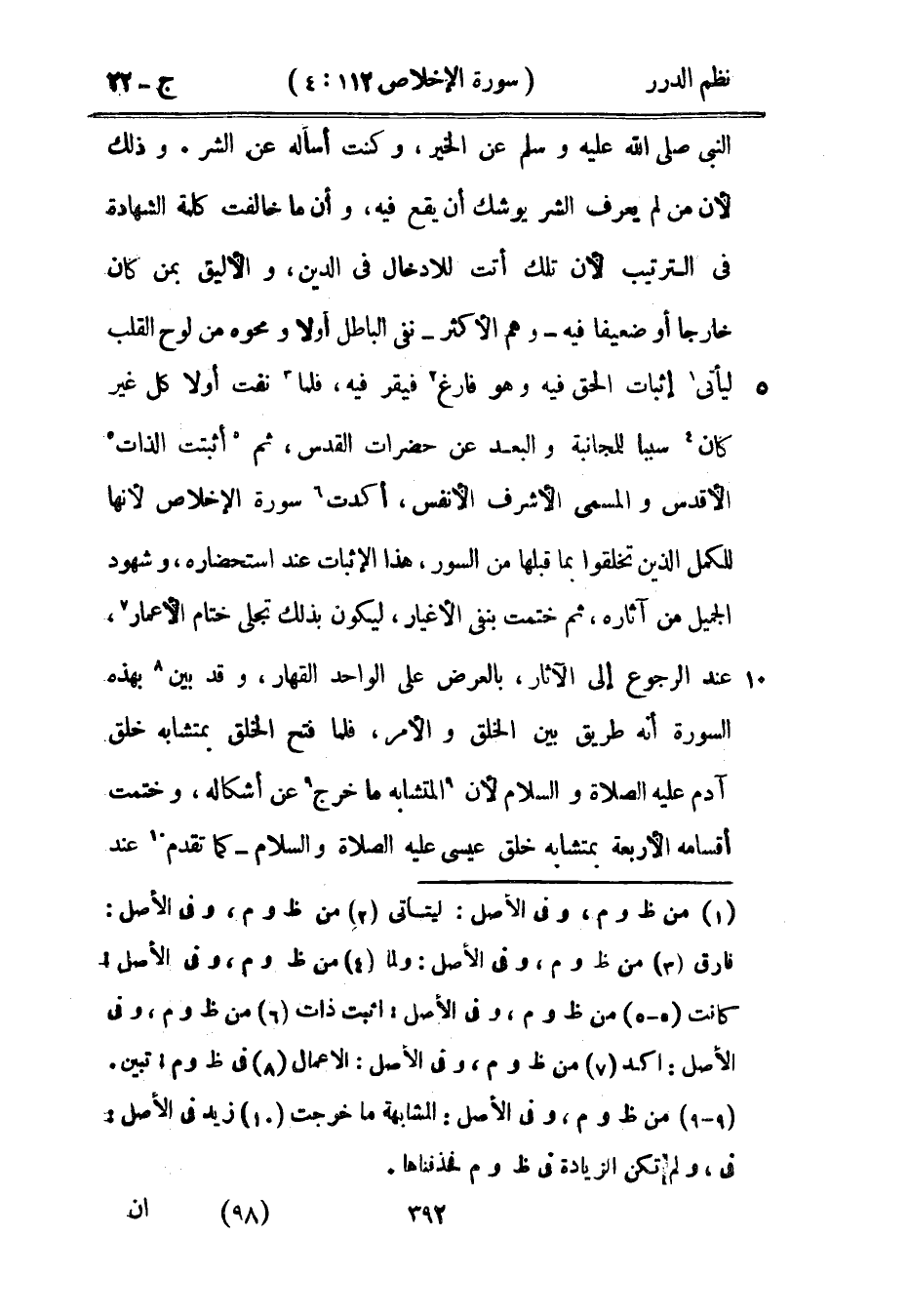 النبي صَلَّى اللهُ عَلَيْهِ وَسَلَّمَ عن الخير، وكنت أسأله عن الشر» وذلك لأن من لم يعرف الشر يوشك أن يقع فيه، وأن ما خالفت كلمة الشهادة في الترتيب لأن تلك أتت للإدخال في الدين، والأليق بمن كان خارجاً أو ضعيفاً - وهم الأكثر - نفي الباطل أولاً ومحوه من لوح القلب ليأتي إثبات الحق فيه وهو فارغ فيقر فيه، فلما نفت أولاً كل غير كان سبباً للمجانبة والبعد عن حضرات القدس، ثم أثبتت الذات الأقدس والمسمى الأشرف الأنفس، أكدت سورة الإخلاص لأنها للكمل الذين تخلقوا بما قبلها من السور، هذا الإثبات عند استحضاره، وشهود الجميل من آثاره، ثم ختمت بنفي الأغيار، ليكون بذلك تجلى ختام الأعمار، عند الرجوع إلى الآثار، بالعرض على الواحد القهار، وقد بين بهذه السورة أنه طريق بين الخلق والأمر، فلما فتح الخلق بمتشابه خلق آدم عليه الصلاة والسلام لأن المتشابه ما خرج عن أشكاله، وختمت أقسامه الأربعة بمتشابه خلق عيسى عليه الصلاة والسلام - كما تقدم عند