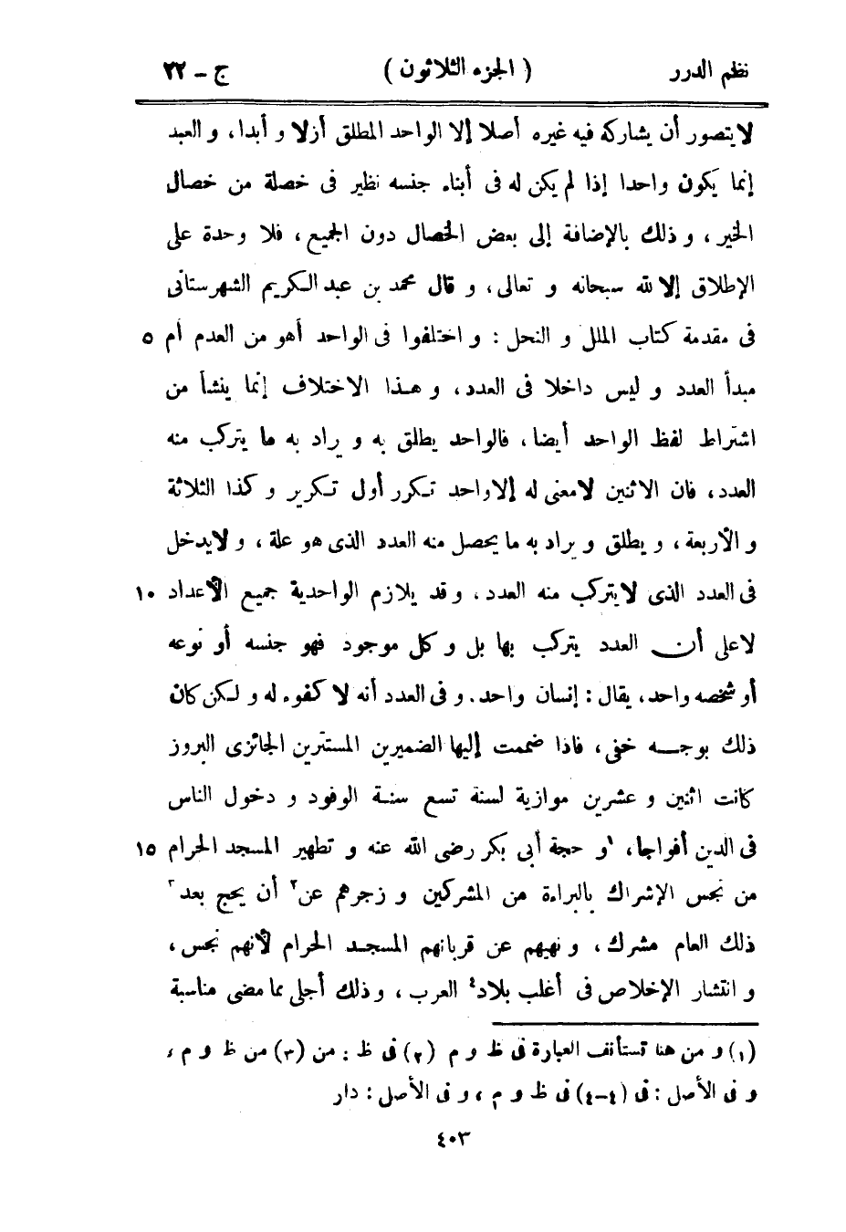 لا يتصور أن يشاركه فيه غيره أصلاً إلا الواحد المطلق أزلاً وأبداً، والعبد إنما يكون واحداً إذا لم يكن له في أبناء جنسه نظير في خصلة من خصال الخير، وذلك بالإضافة إلى بعض الخصال دون الجميع، فلا وحدة على الإطلاق إلا لله سبحانه وتعالى، وقال محمد بن عبد الكريم الشهرستاني في مقدمة كتاب الملل والنحل: واختلفوا في الواحد أهو من العدم أم مبدأ العدد وليس داخلاً في العدد، وهذا الاختلاف إنما ينشأ من اشتراط لفظ الواحد أيضاً، فالواحد يطلق به ويراد به ما يتركب منه العدد، فإن الاثنين لا معنى له إلا واحد تكرر أول تكرير وكذا الثلاثة والأربعة، ويطلق ويراد به ما يحصل منه العدد الذي هو علة، ولا يدخل في العدد الذي لا يتركب منه العدد، وقد يلازم الواحدية جميع الأعداد لا على أن العدد يتركب بها بل وكل موجود فهو جنسه أو نوعه أو شخصه واحد، يقال: إنسان واحد، وفي العدد أنه لا كفوء له ولكن كان ذلك بوجه خفي، فإذا ضممت إليها الضميرين المستترين الجائزي البروز كانت اثنين وعشرين موازية لسنة تسع سنة الوفود ودخول الناس في الدين أفواجاً، وحجة أبي بكر رضي الله عنه وتطهير المسجد الحرام من نجس الإشراك بالبراءة من المشركين وزجرهم عن أن يحج بعد ذلك العام مشرك، ونهيهم عن قربانهم المسجد الحرام لأنهم نجس، وانتشار الإخلاص في أغلب بلاد العرب، وذلك أجلى مما مضى مناسب