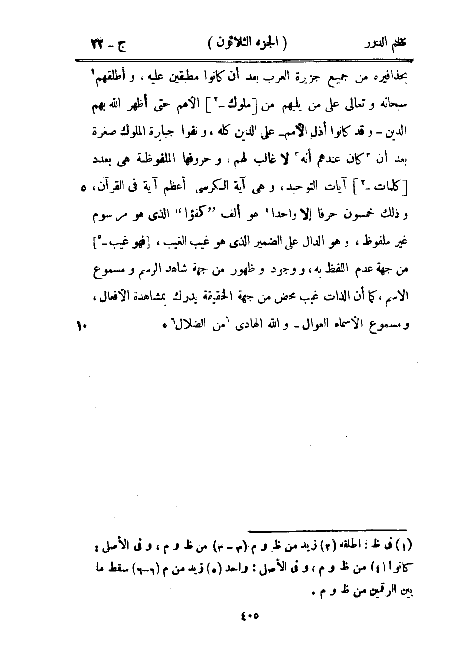بحذافيره من جميع جزيرة العرب بعد أن كانوا مطبقين عليه، وأطلقهم سبحانه وتعالى على من يليهم من ملوك الأمم حتى أظهر الله بهم الدين - وقد كانوا أذل الأمم - على الدين كله، ونفوا جبابرة الملوك صغرة بعد أن كان عندهم أنه لا غالب لهم، وحروفها الملفوظة هي بعدد كلمات - آيات التوحيد، وهي آية الكرسي أعظم آية في القرآن، وذلك خمسون حرفاً إلا واحداً هو ألف {كفواً} الذي هو مرسوم غير ملفوظ، وهو الدال على الضمير الذي هو غيب الغيب، فهو غيب - من جهة عدم اللفظ به، ووجود وظهور من جهة شاهد الرسم ومسموع الاسم، كما أن الذات غيب محض من جهة الحقيقة يدرك بمشاهدة الأفعال، ومسموع الأسماء العوال - والله الهادي من الضلال.