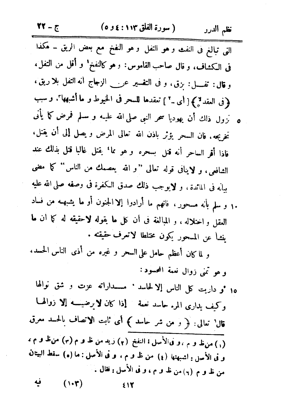التي تبالغ في النفث وهو التفل وهو النفخ مع بعض الريق - هكذا في الكشاف، وقال صاحب القاموس: وهو كانفخ وأقل من التفل، وقال: تفل: بزق، وفي التفسير عن الزجاج أنه التفل بلا ريق، {في العقد *} أي تعقدها للسحر في الخيوط وما أشبهها، وسبب نزول ذلك أن يهودياً سحر النبي صَلَّى اللهُ عَلَيْهِ وَسَلَّمَ فمرض كما ياتي تخريجه، فإن السحر يؤثر بإذن الله تعالى المرض ويصل إلى أن يقتل، فإذا أقر الساحر أنه قتل بسحره وهو مما يقتل غالباً قتل بذلك عند الشافعي، ولا ينافي قوله تعالى: {والله يعصمك من الناس} [المائدة: 67] كما مضى بيانه في المائدة، ولا يوجب ذلك صدق الكفرة في وصفه صَلَّى اللهُ عَلَيْهِ وَسَلَّمَ بأنه مسحور، فإنهم ما أرادوا إلا الجنون أو ما يشبهه من فساد العقل واختلاله، والمبالغة في أن كل ما يقوله لا حقيقه له كما أن ما ينشأ عن المسحور يكون مختلطاً لا تعرف حقيقته.