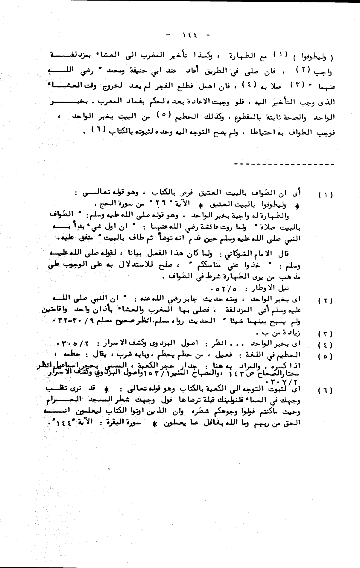 (وليطوفوا) مع الطهارة، وكذا تأخير المغرب إلى العشاء بمزدلفة واجب، فإن صلى في الطريق أعاد عند أبي حنيفة ومحمد رضي الله عنهما؛ عملا به، فإن أهمل فطلع الفجر لم يعد لخروج وقت العشاء الذي وجب التأخير إليه، فلو وجبت الإعادة بعده لحكم بفساد المغرب بخبر الواحد، والصحة ثابتة بالمقطوع.