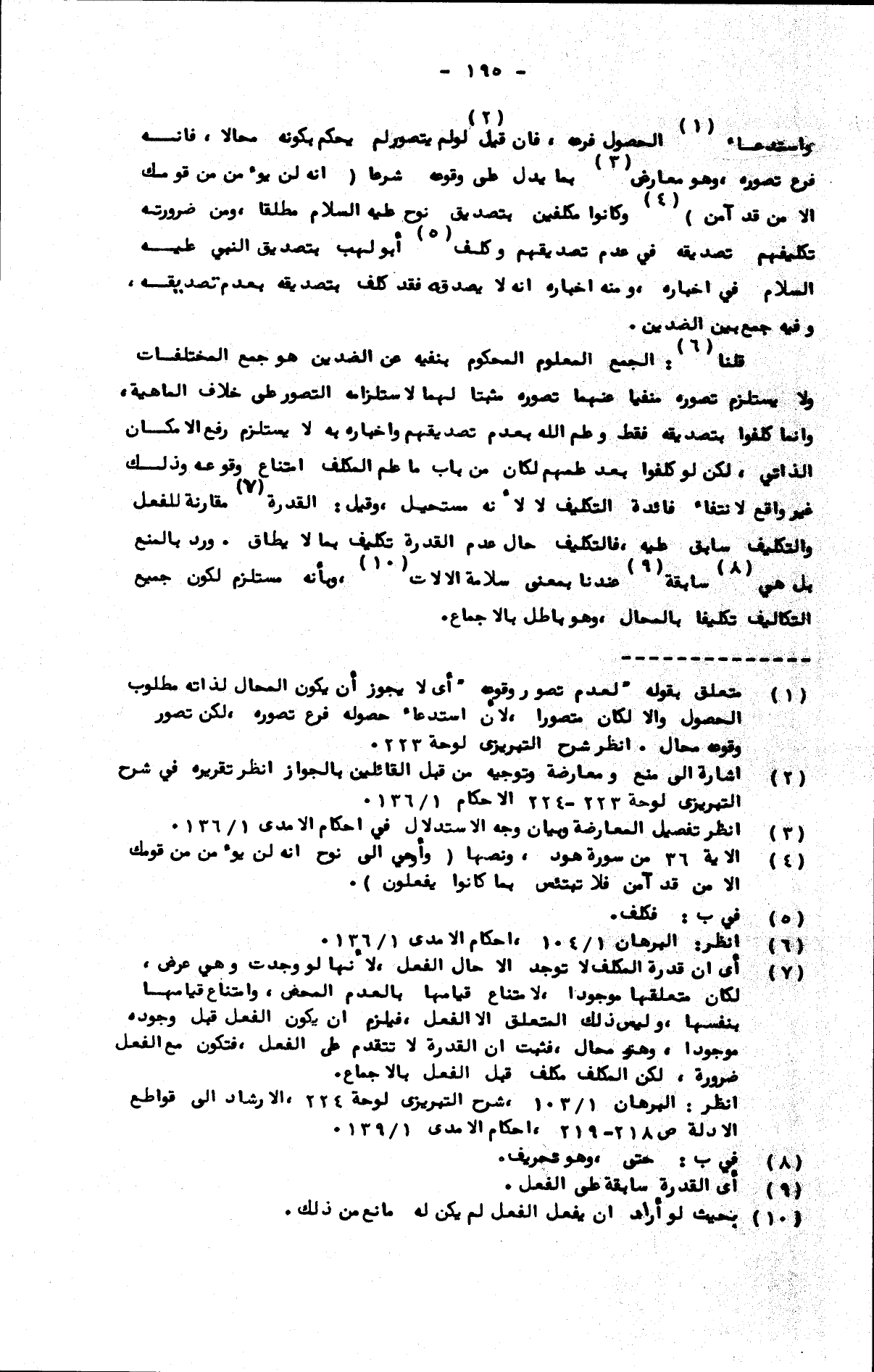 فإن قيل: لو لم يُتصوَّرْ لم يُحكم بكونه محالا، فإنه فرعُ تصورِه، وهو مُعارَض بما يدلُّ على وقوعه شرعا؛ چ أَنَّهُ لَنْ يُؤْمِنَ مِنْ قَوْمِكَ ? ... ? قَدْ آمَنَ چ، وكانوا مكلفين بتصديق نوحٍ مطلقا، ومن ضرورته تكليفُهم تصديقَه في عدم تصديقهم، وكُلف أبو لهب بتصديق النبي (صلى الله عليه وسلم) في إخباره، ومنه إخبارُه أنه لا يصدِّقه، فقد كلَّفه بتصديقه بعدمِ تصديقه، وفيه جمعٌ بين الضدَّين.