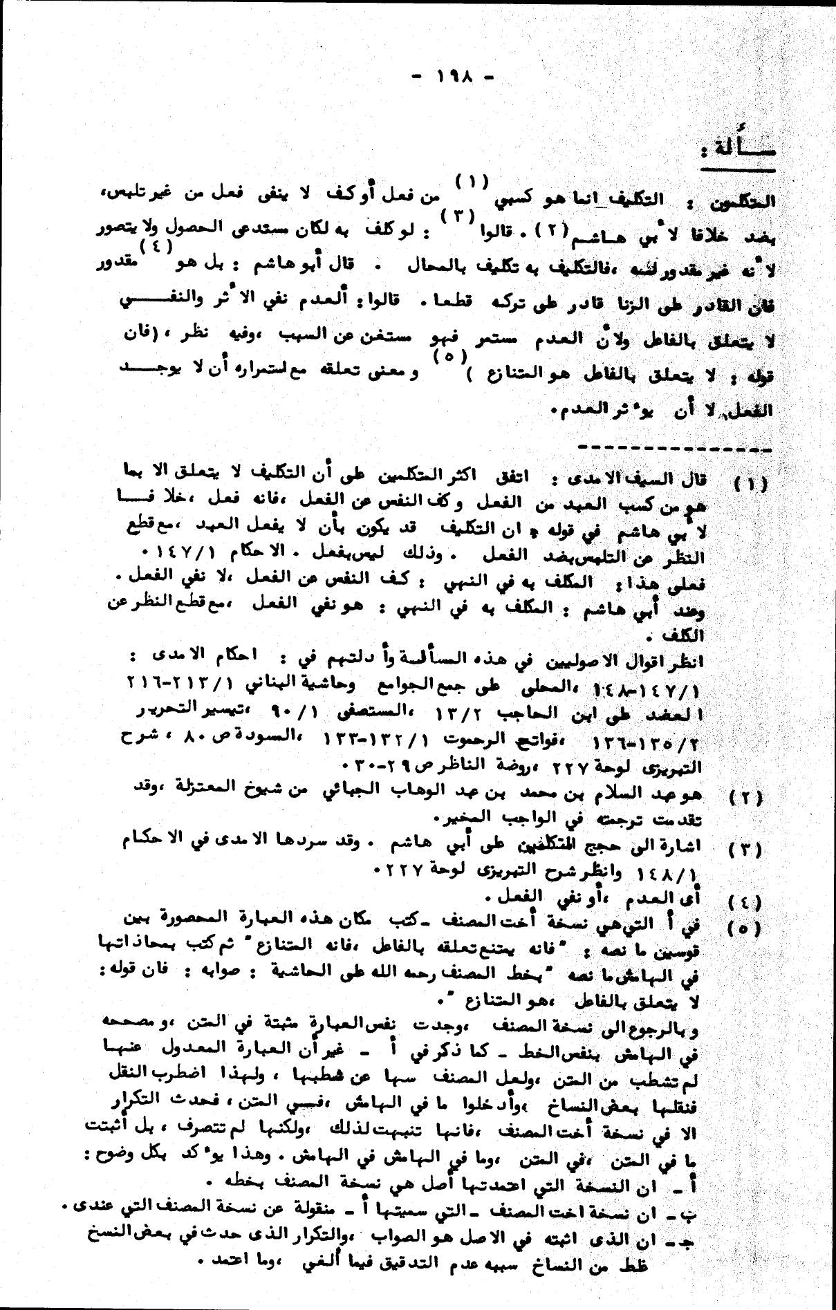المتكلمون: التكليفُ إنما هو كسبي؛ من فعلٍ أو كفٍّ، لا بنفيِ فعلٍ من غير تلبُّسٍ بضدٍّ، خلافا لأبي هاشم.