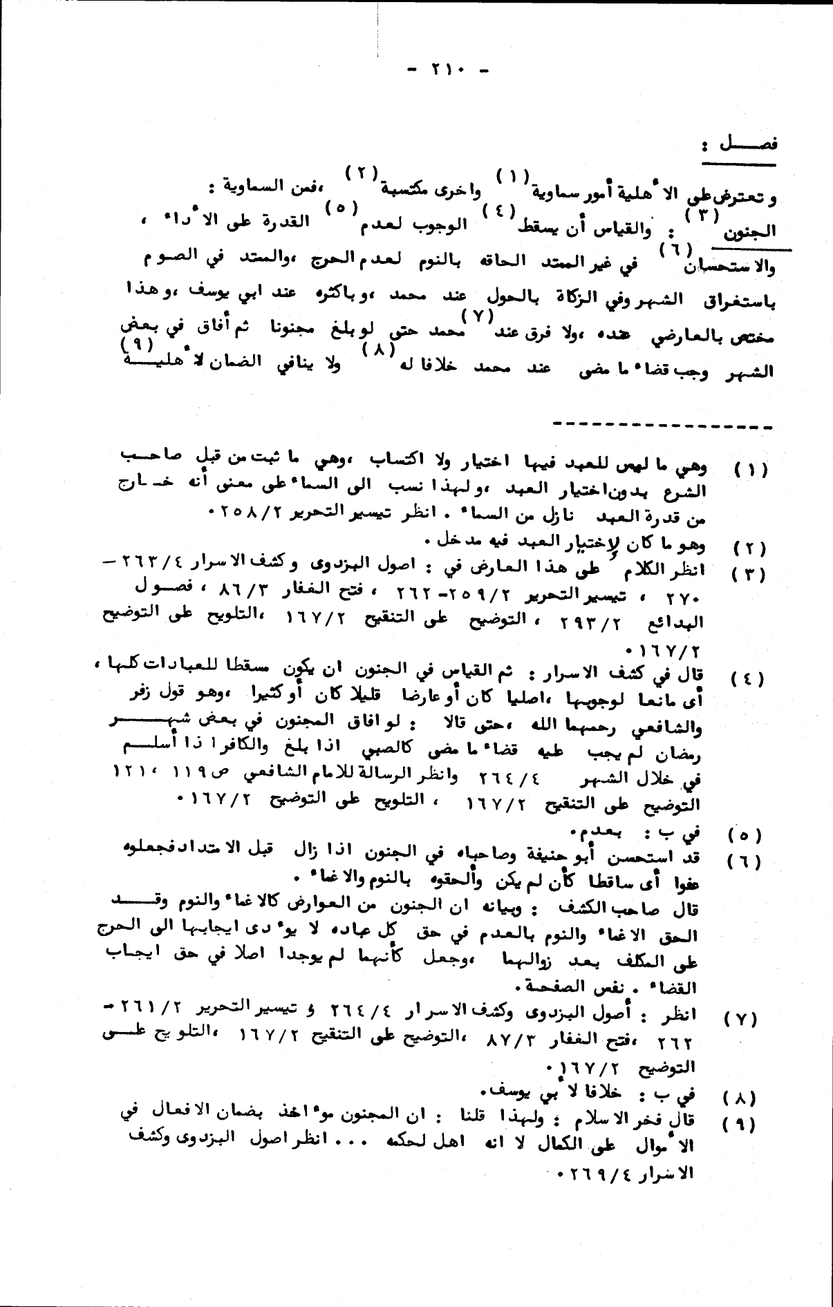 وتَعترِضُ على الأهلية أمورٌ سماويةٌ وأُخَرُ مكتسبةٌ؛ فمِن السماوية: الجنونُ، والقياسُ أن يسقط الوجوبُ لعدم القدرة على الأداء، والاستحسانُ في غير الممتدِّ إلحاقُه بالنوم؛ لعدَم الحرج، والممتدُّ في الصوم باستغراق الشهر، وفي الزكاة بالحول عند محمد، وبأكثره عند أبي يوسف، وهذا مختصٌّ بالعارضي عندَه، ولا فرق عند محمد، حتى لو بلَغ مجنونا ثم أفاق في بعض الشهر، وجَب قضاءُ ما مضى عند محمد خلافا له، ولا يُنافي الضمانَ؛ لأهلية