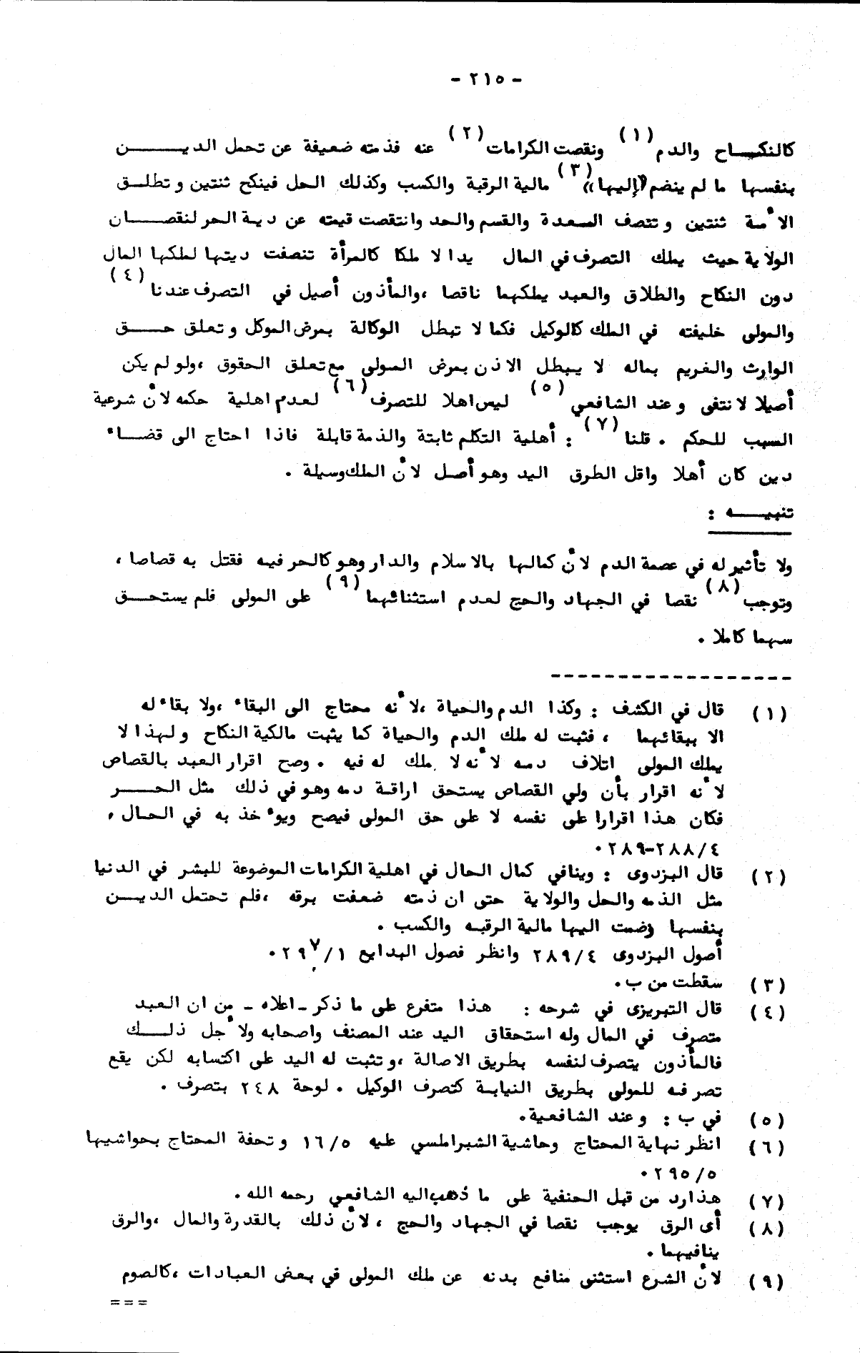 كالنكاح والدم، ونقصت الكرامات عنه فذمتُه ضعيفة عن تحمُّل الدَّينِ بنفسها، ما لم ينضم إليها ماليةُ الرقبة والكسب، وكذلك الحَلُّ، فينكح ثِنْتَين، وتُطلق الأمة ثِنْتَين، وتُنَصف العدةُ والحدُّ والقَسْم، وانتقصت قيمتُه عن دية الحرِّ؛ لنقصان الولاية؛ حيث يَملِك التصرفَ في المال يدًا لا مِلكًا، كالمرأة تنصفت ديتُها لملكها المالَ دون النكاحِ والطلاقِ، والعبدُ يملكهما ناقصًا