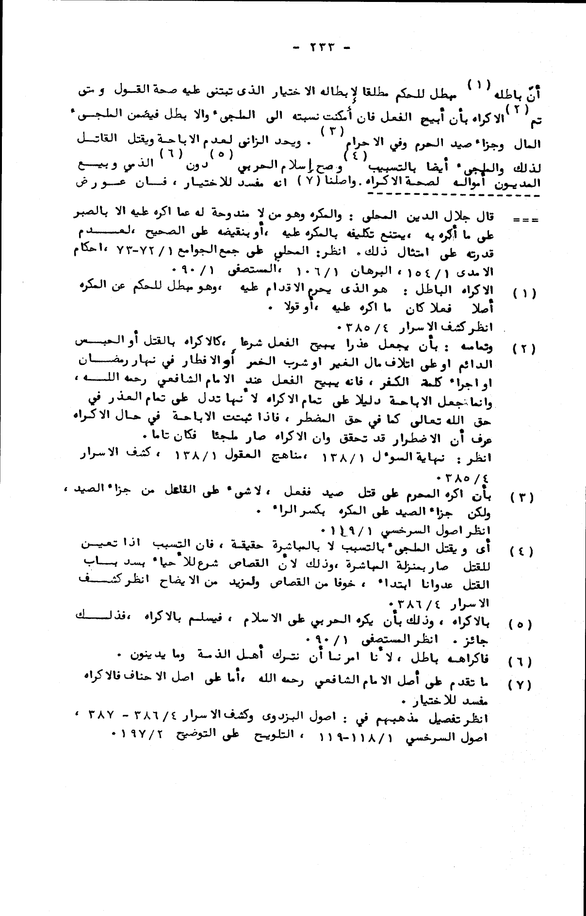 أن باطلَه مُبطلٌ للحكم مطلقا؛ لإبطاله الاختيارَ الذي تَبتني عليه صحةُ القول، ومتى تم الإكراهُ -بأن أبيح الفعل- فإن أمكنت نسبتُه إلى الملجئ، وإلا بطل، فيضمن الملجئ المال وجزاء صيد الحرم وفى الإحرام، ويحد الزاني لعدم الإباحة، ويقتل القاتل لذلك، والملجئ أيضا بالتسبب، وصح إسلام الحربي دون الذمي، وبيعُ المديونِ أموالَه لصحة الإكراه.